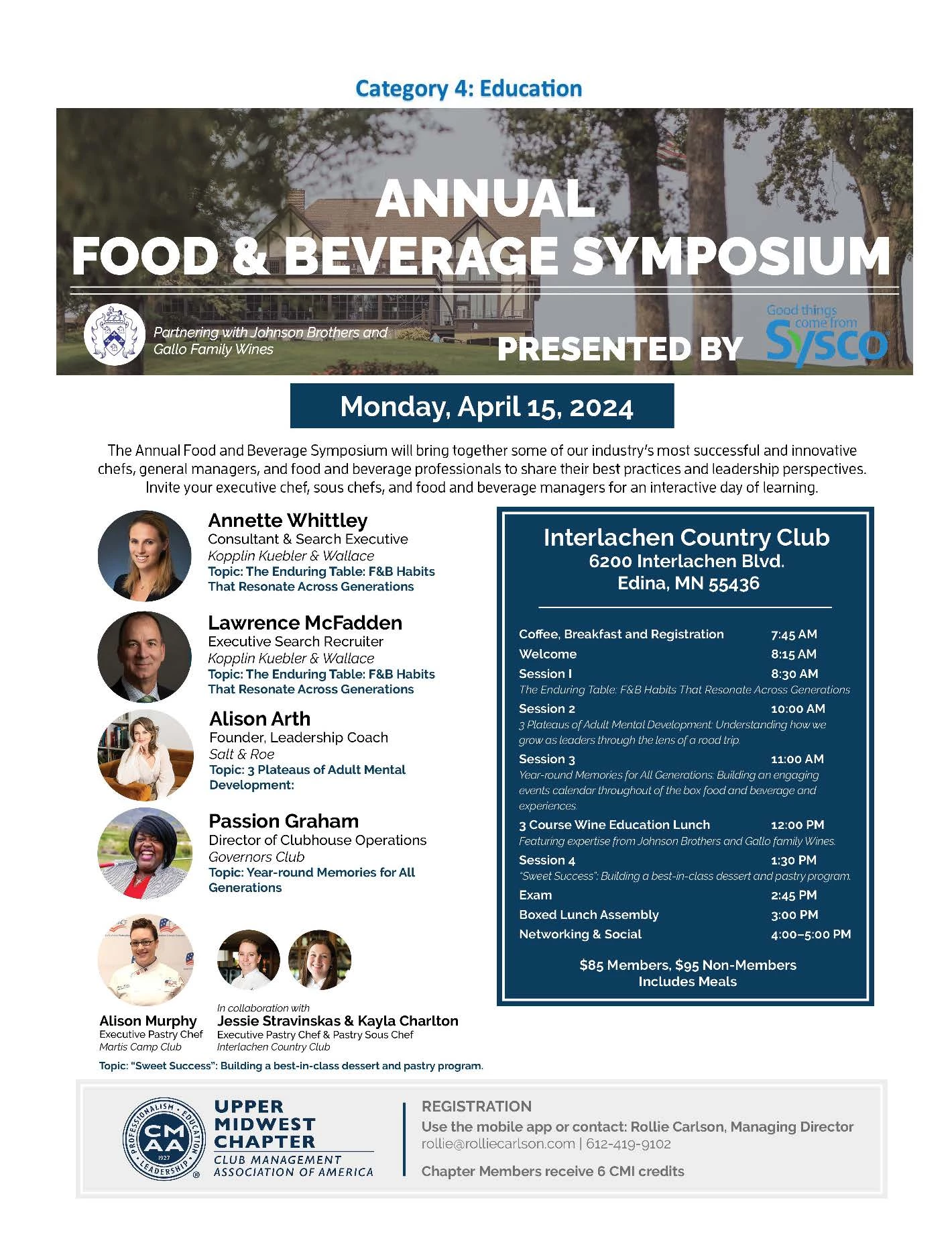 The education opportunity at the symposium addresses all facets of food & beverage at the attendees club. Many of the speakers have presented at the World Conference and at scores of clubs across the country. The influence of their messages coupled with a local flavor of presenters positions this annual food & beverage symposium as a must attend not only by chapter members but members of their respective staffs.