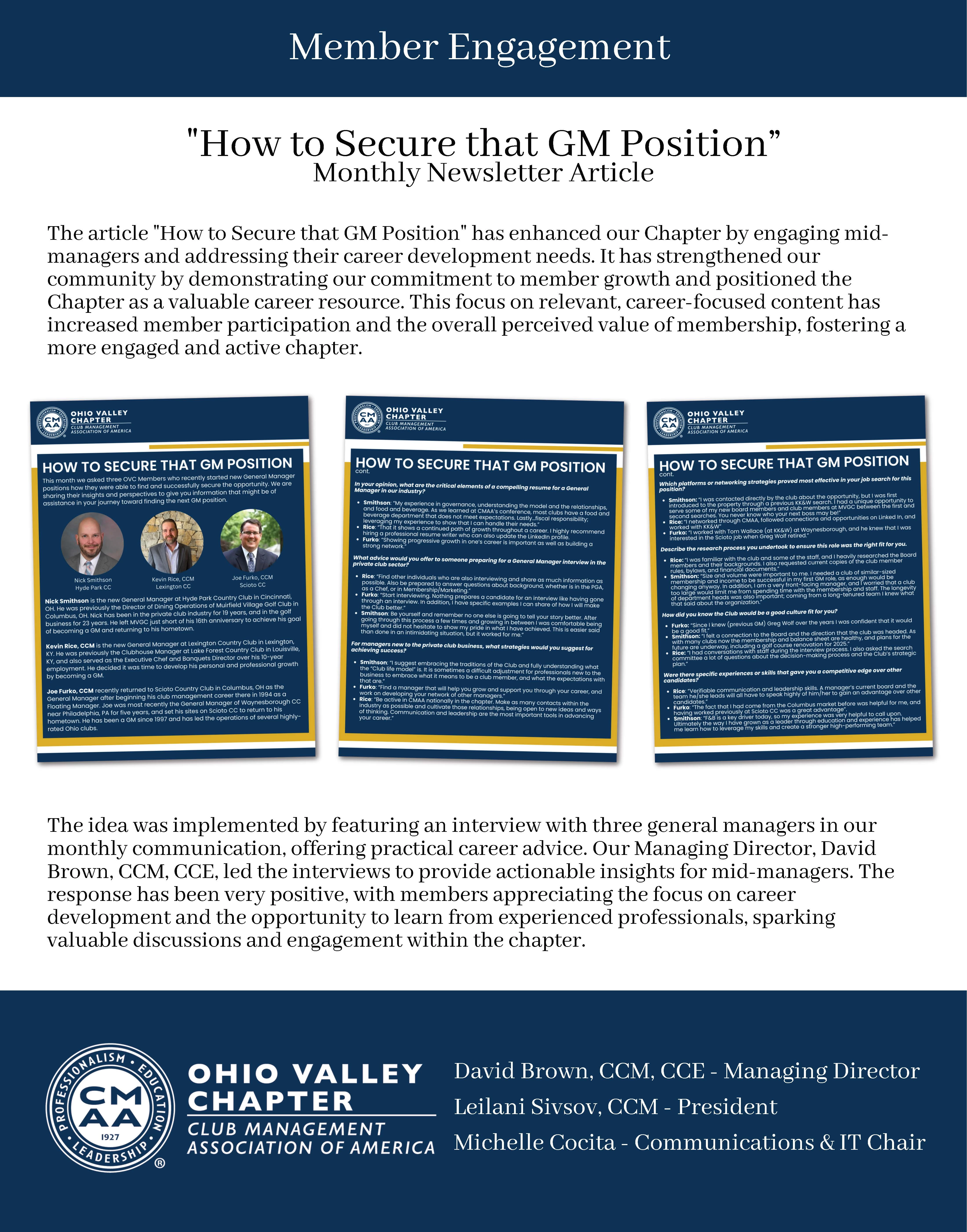 The idea was implemented through a strategic addition to our monthly communication, spearheaded by our Managing Director, David Brown, CCM, CCE. He conducted insightful interviews with three general managers at different career stages, focusing on the essential aspects of securing a GM position. The content was designed to be both informative and inspirational, aiming to resonate with mid-managers by providing practical advice and firsthand experiences. The general reaction from chapter members has been overwhelmingly positive. Many expressed appreciation for the actionable insights and the spotlight on career development. The article has sparked meaningful discussions and feedback within the chapter, demonstrating its effectiveness in engaging our members and fostering a culture of continuous learning and professional growth.