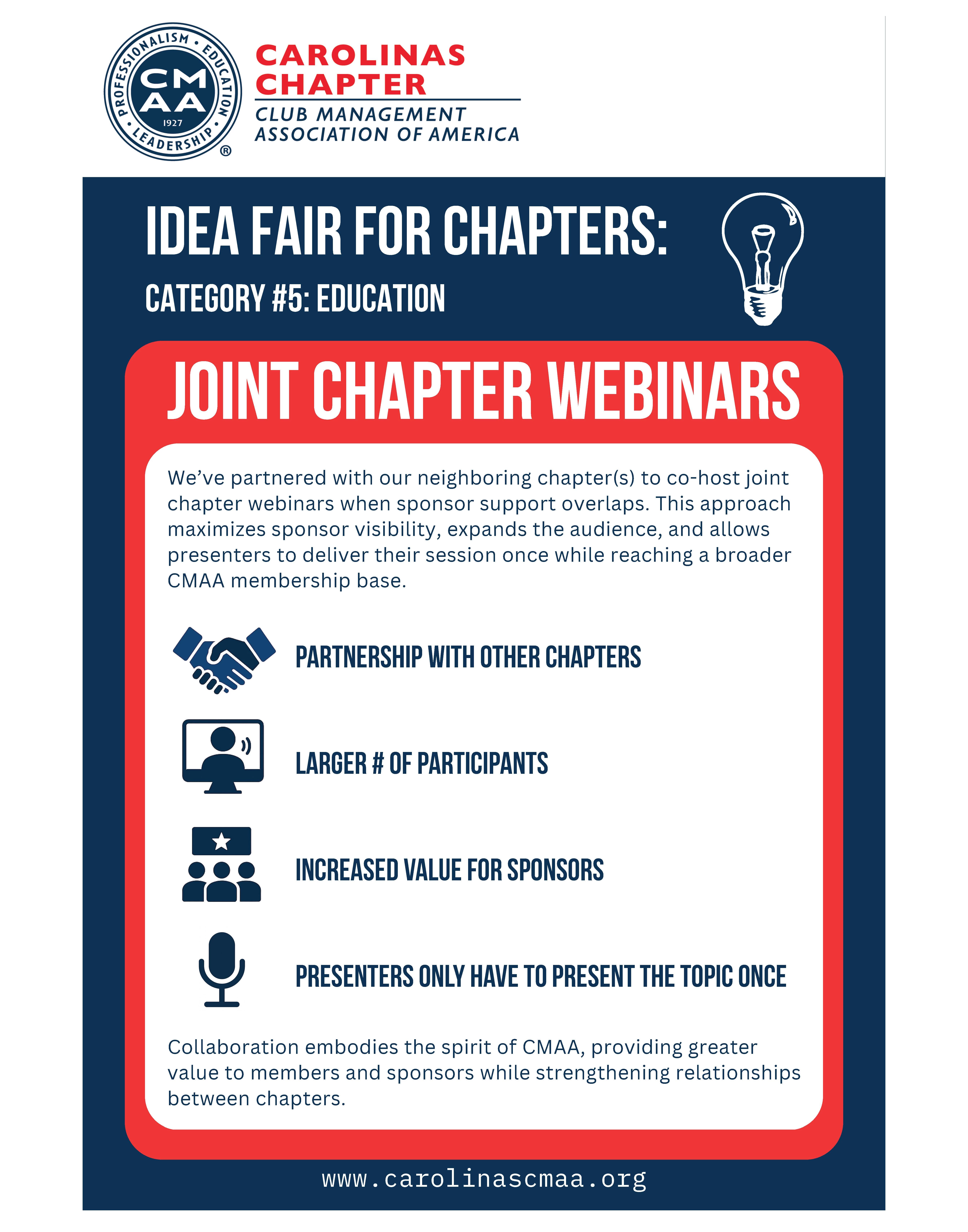 The Carolinas Chapter implemented this idea by identifying overlapping sponsors with neighboring chapters and then working together to schedule joint webinars. Instead of each chapter hosting separate sessions, the sponsor is featured once, and the webinar is promoted across both chapters. This approach ensures: - One-time delivery for presenters, minimizing duplication of effort. - Combined marketing and registration, which increases attendance and visibility. - Shared administrative responsibilities, making it easier on chapter staff. Overall, the reaction has been that this collaboration embodies the spirit of CMAA, providing greater value to members and sponsors while strengthening relationships between chapters.