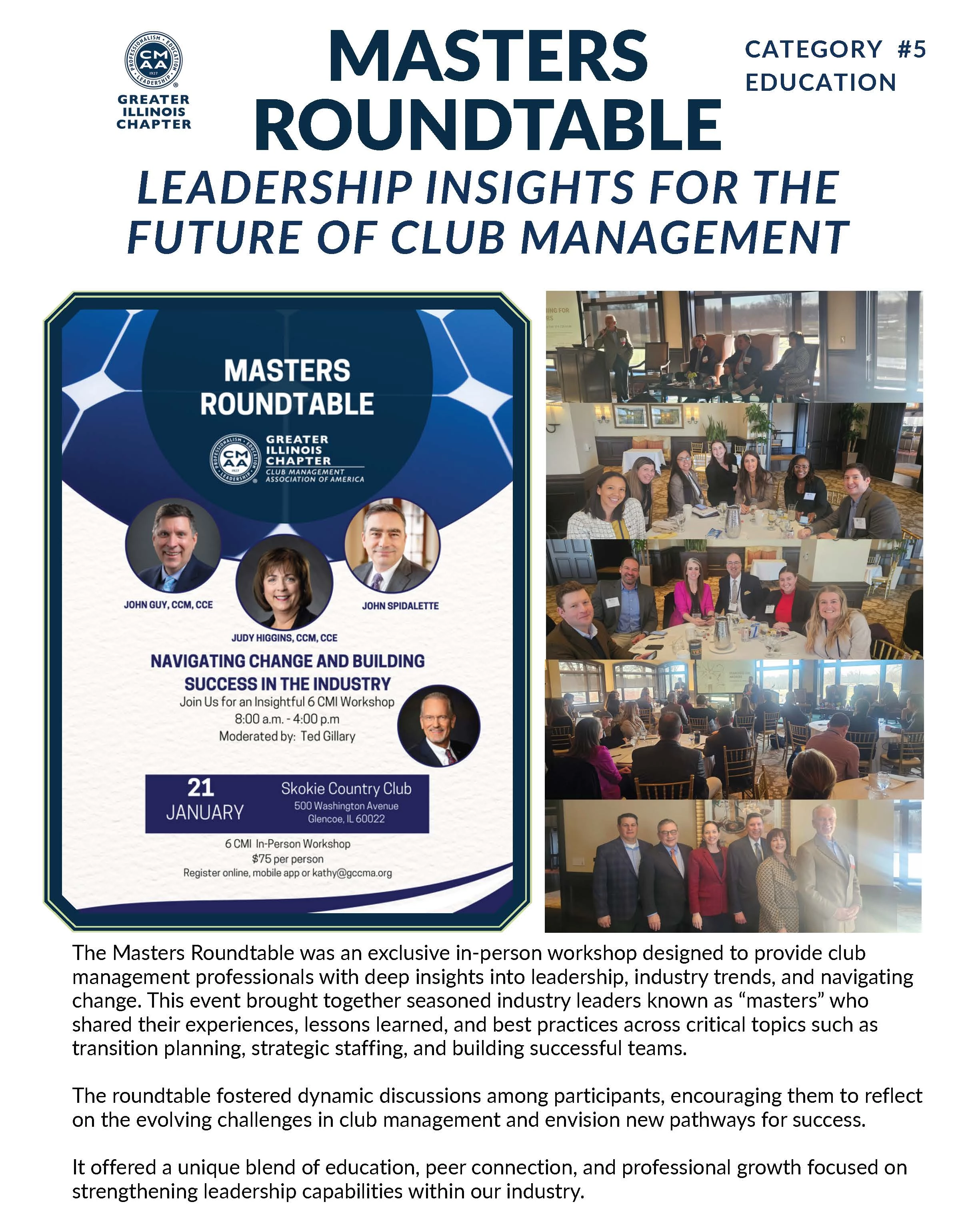 The Masters Roundtable was held as a day-long, in-person workshop hosted at Skokie Country Club, moderated by renowned industry consultant Ted Gillary. The program featured distinguished leaders including John Guy, CCM, CCE, Judy Higgins, CCM, CCE and John Spidalette, each sharing personal career insights and actionable advice. The agenda combined focused learning with networking opportunities, including a chapter business meeting, breakfast, lunch, and a concluding happy hour with a club tour. Participants appreciated the intimate setting and candid conversations, expressing that the opportunity to learn directly from highly experienced professionals was invaluable. Feedback emphasized how the event helped members better navigate change, develop effective strategies, and build meaningful connections across the industry, making it a standout program for leadership development.