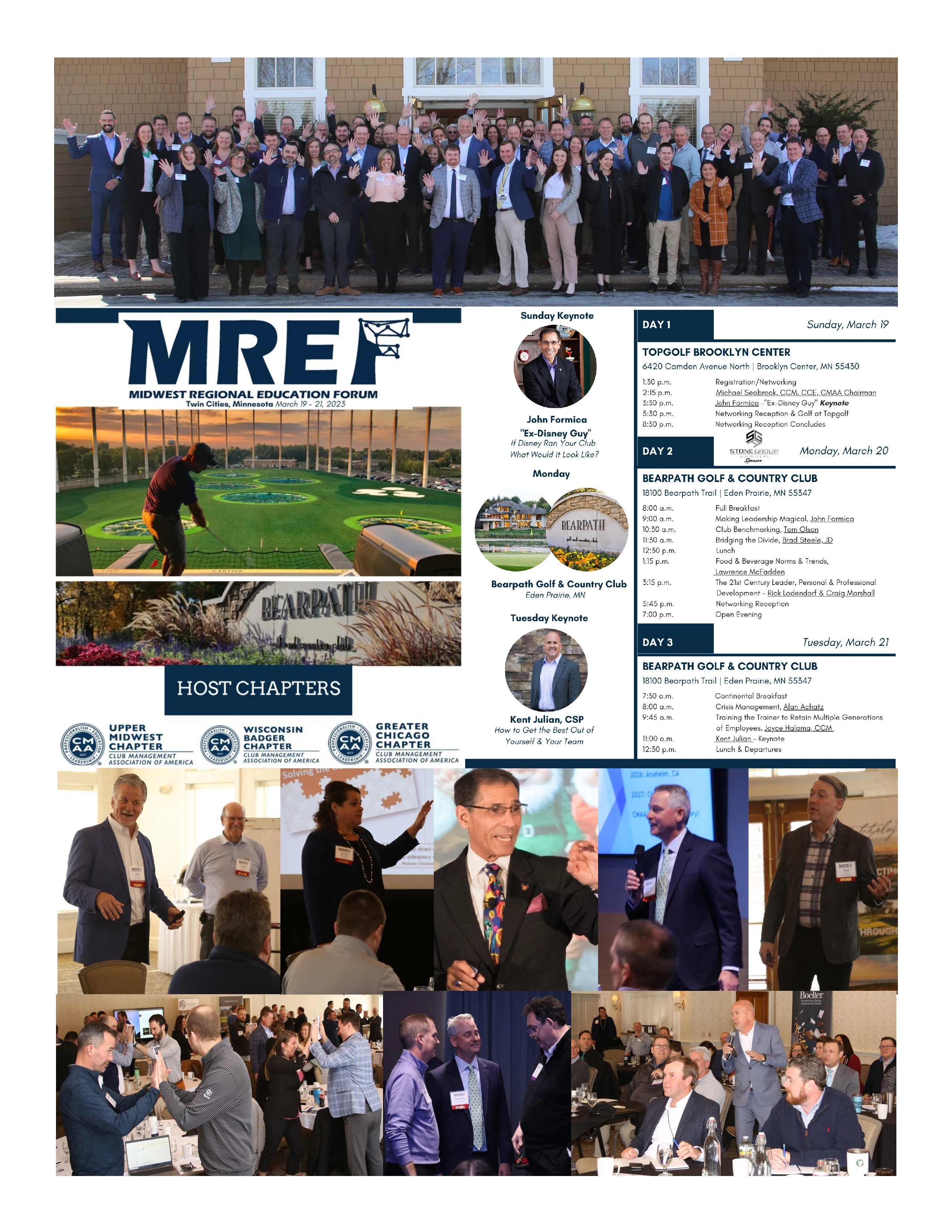 The Midwest Regional Education Forum location is rotated between the Upper Midwest, Wisconsin-Badger and the Great Chicago CMAA chapters in alternating years. 2023 was the Upper Midwest chapters turn to host. If the forum was to live up to its billing as a Mini WORLD CONFERENCE then the first speaker had to represent CMAA’s leadership - Board Chair Michael Seabrook-CCM, CCE presented the opening keynote. Over the course of the forum the speakers came from the CMAA community as well as nationally recognized club and hospitality industry leaders and professionals. Many of those speakers have been speakers at the WORLD CONFERENCE. The aggregate rating of all speakers was 92% above average to excellent. When it came to fostering professional development, education and networking a very unique opening venue was chosen – TOPGOLF. Education during the opening day initial 3+ hours was followed by the attendees experiencing TOPGOLF’s signature offering – golf and provided the ultimate networking platform. The venue for the remaining day and a half of the forum was a formidable chapter member club, the Bearpath Golf & Country Club.