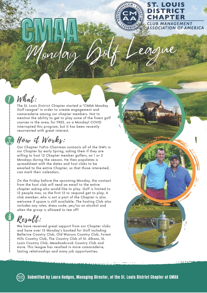 Our chapter Board was looking for a way to engage our newer younger members, something outside of education and meetings. We came up with the idea of formally offering golf on Mondays when clubs are closed. This gives our members the opportunity to see and play other courses, and to meet other members of the chapter in a relaxing and social setting, free of charge. This also serves to educate chapter members with regard to the competition in the local market place. Not to mention networking for future employment.