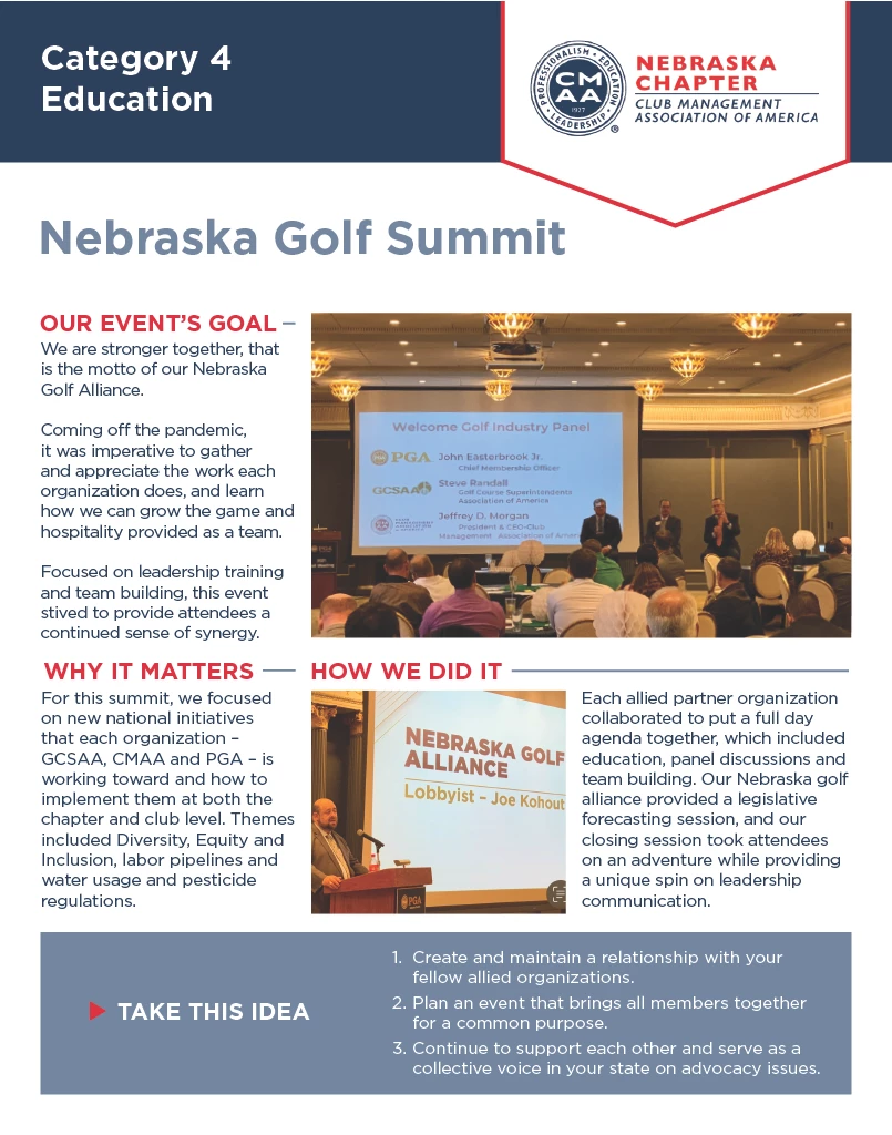 Each allied partner organization collaborated to put a full day agenda together, which included education, panel discussions and team exercises. Our Nebraska Golf Alliance provided a legislative forecasting session, and our closing session took attendees on an adventure while providing a unique spin on leadership communication. Members enjoyed spending a day with their allied association peers from within their same facility.