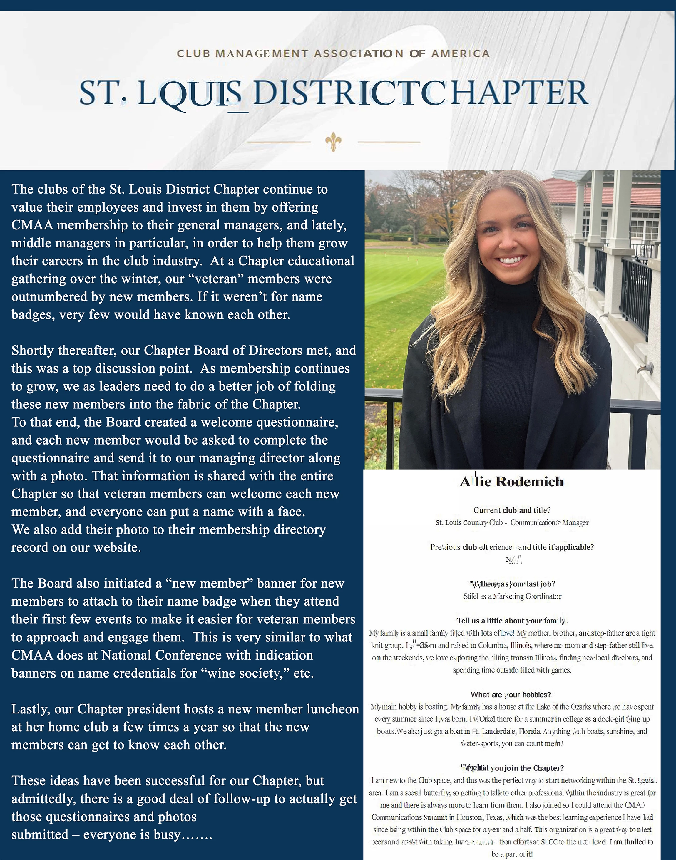 We created an email welcome questionnaire for the new member to complete and send back. We then send an eblast to all chapter members welcoming the new members with the answers to their questionnaire and their photograph.