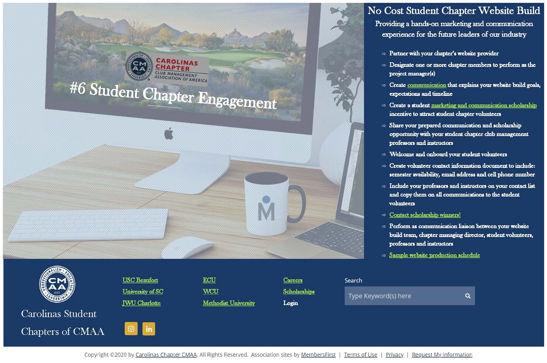 We began by negotiating a no cost website with our Chapter’s website provider and Chapter partner MembersFirst. The purpose and benefit of creating a sister website for our Student Chapter(s) is multifold. It will provide a home to highlight each of our six Student Chapters' accomplishments and accolades, Chapter membership roster, Student Chapter leaders, and upcoming events on the student, Chapter, and national level. Our students will be able to use the website to search for career and scholarship opportunities, and it will also be an excellent tool for recruitment as we highlight alumni that have graduated to begin successful careers in the private club industry. Additionally, we are providing a hands-on marketing and communication experience for the future leaders of our industry! Our first-year student volunteers are contributing to the original website content build and will update their Chapter's information on the website throughout the designated school year. All future student volunteers will update their Chapter’s information on the website throughout the designated school year and participate in all website programming updates and upgrades.