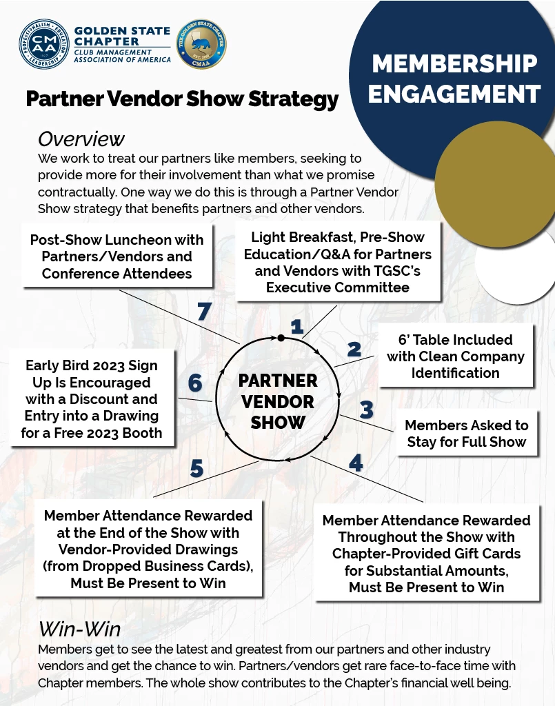 At some pre-COVID Partner Vendor Shows, we noticed too many members taking a break instead of visiting the Partner Vendor Show at the assigned time. To combat this, we took the following multi-pronged approach in 2022: 1) We prep our partners and vendors for how to best engage with members. 2) We provide clean company identification at each table. 3) Members are asked to stay for the full show, and then rewarded for doing so with 4) sizable gift card drawings throughout the show and 5) generous drawings from partners and vendors at the end of the show. If they are not present, they cannot win. We keep the excitement moving for the next show's iteration by 6) providing an early bird discount and free booth drawing for partners and vendors who sign up for the next year before the end of the show. We create additional space for networking between partners, vendors, and members with our post-show luncheon open to all. This approach has enhanced our chapter by increasing vendor and member interactions at our trade shows. It seems to have increased our number of partners/vendors as well with 37 having exhibited at our 2022 iteration, making it more convenient than ever for members to meet with many of their current and prospective suppliers all in one place.