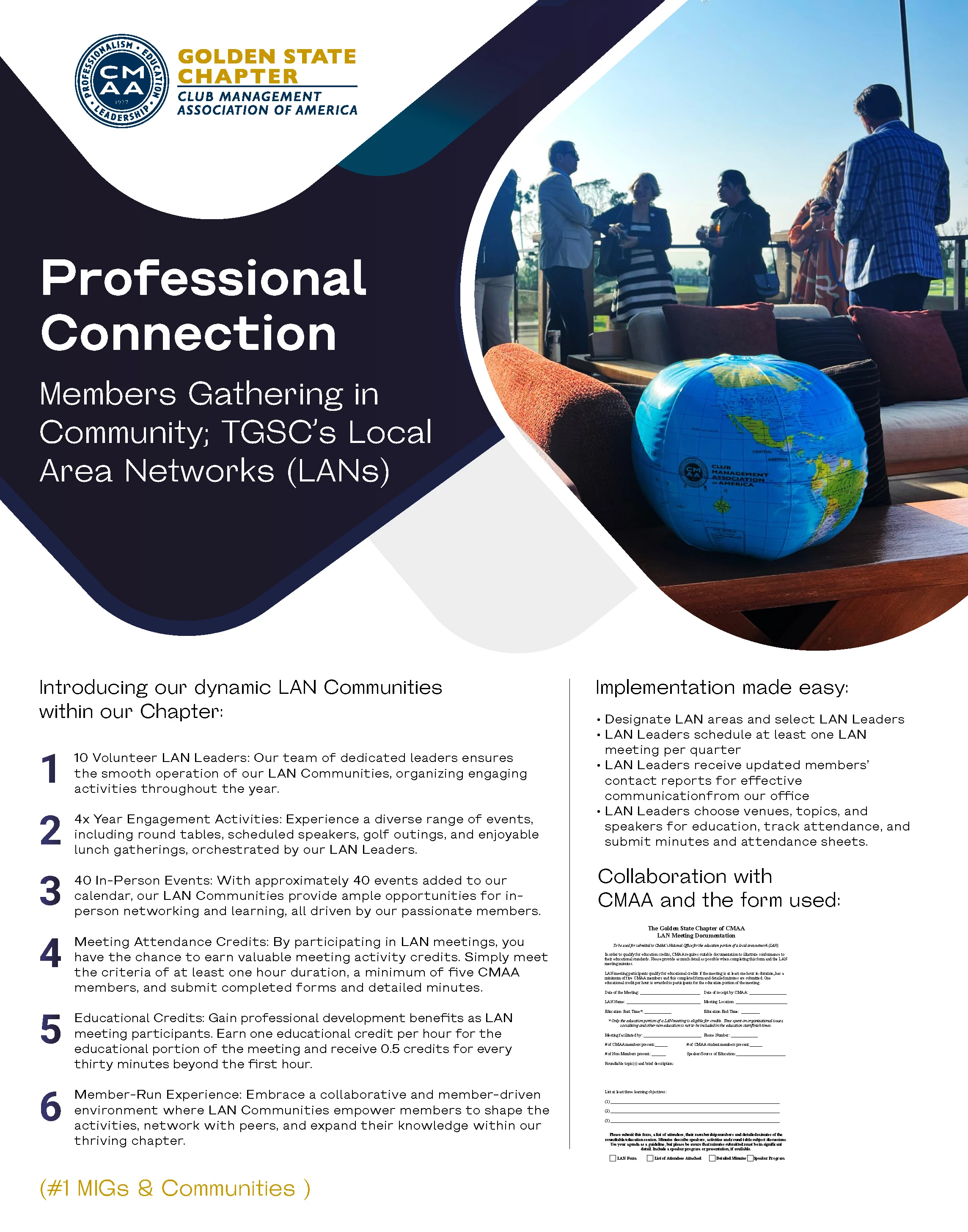 The introduction of our Local Area Networks (LANs) has significantly enriched the Golden State Chapter's offerings. These dynamic LAN Communities provide members with a professional and connected platform to engage and learn. With 10 dedicated LAN Leaders at the helm, these communities organize a variety of engaging activities throughout the year. From round tables to golf outings, approximately 40 in-person events now grace our calendar, fostering networking and knowledge-sharing opportunities. Notably, these LANs offer attendees valuable meeting and educational credits, creating a holistic professional development experience. This initiative has empowered members to actively shape activities, network, and elevate their professional journey, rendering our chapter more vibrant, collaborative, and member-driven.