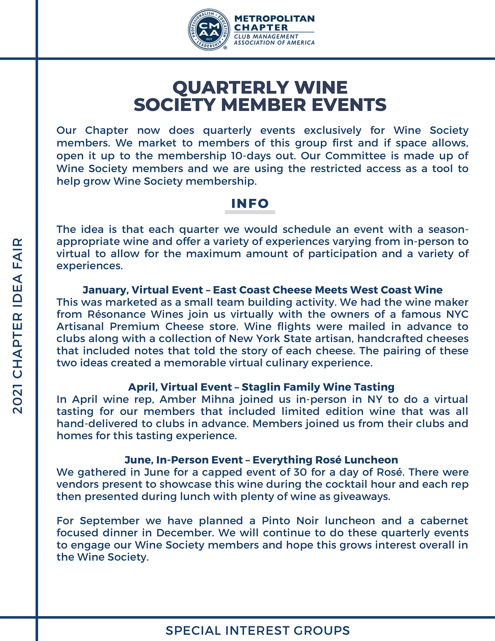 Our Chapter now does quarterly events exclusively for Wine Society members. We market to members of this group first and if space allows, open it up to the membership 10-days out. Our Committee is made up of Wine Society members and we are using the restricted access as a tool to help grow Wine Society membership.