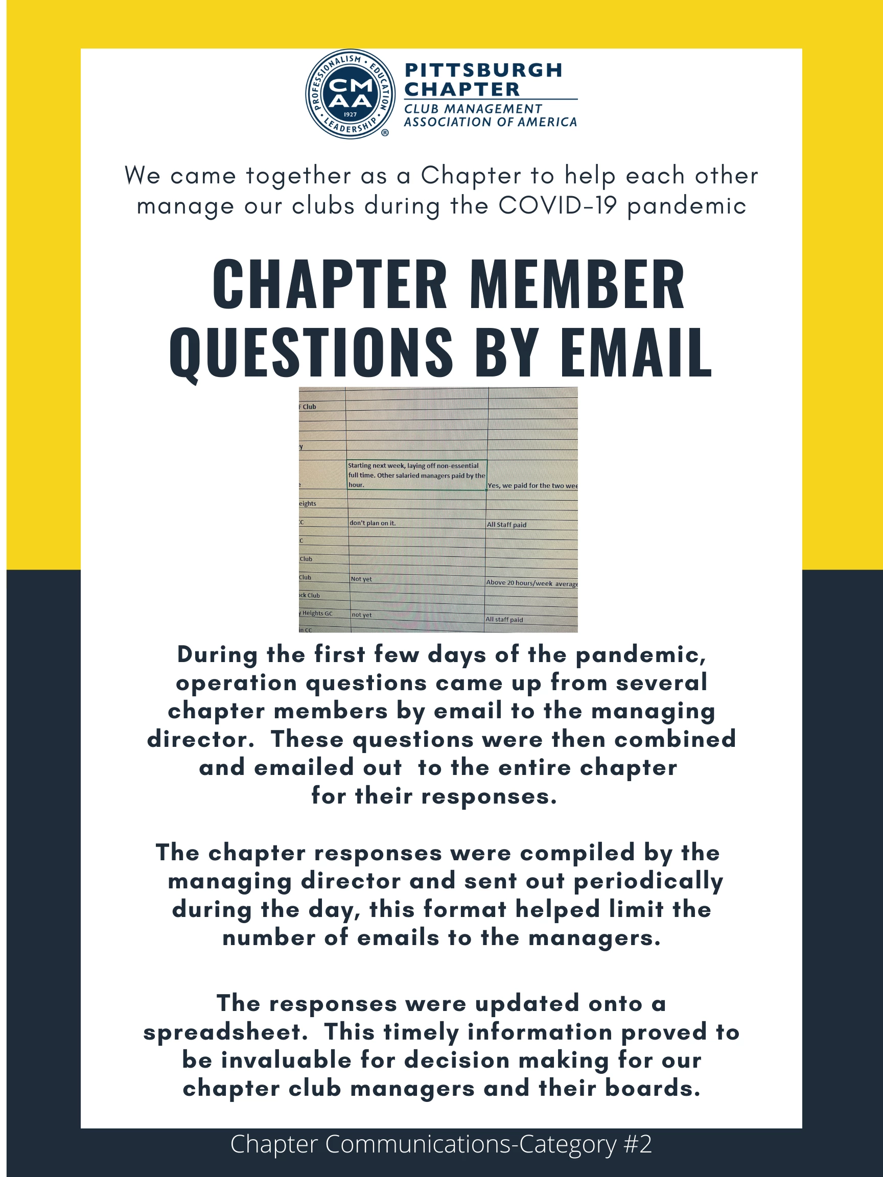 In beginning of the pandemic and operating restrictions were coming so quickly many club managers in the chapter were turning to the chapter MD for help. In response to the many questions from chapter members one email was sent out and as responses came back to the MD, the answers were compiled and sent out frequently. This helped eliminate the amount of emails the chapter member had to deal with. Compiling the information onto a spreadsheet aided the club manager at their emergency board meetings and making operation decisions in a ever changing environment. The chapter members were thrilled with the flow and level of information in this unimaginable time.