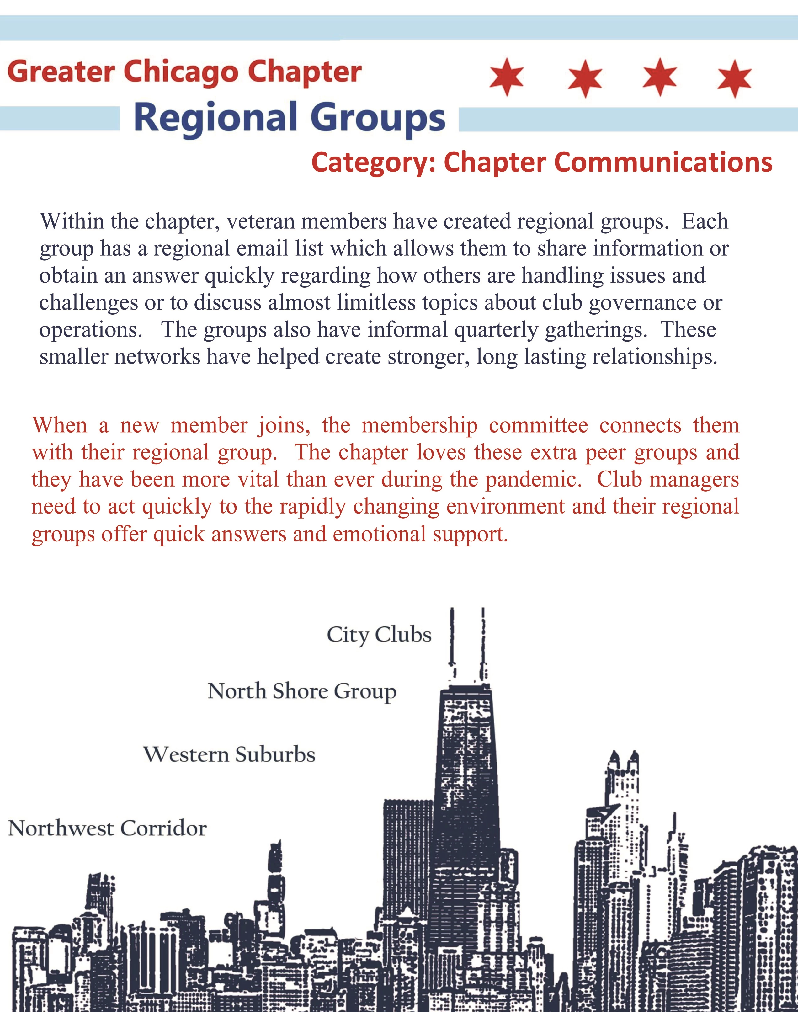 Within the chapter, veteran members have created regional groups. Each group has a regional email list which allows them to share information or obtain an answer quickly regarding how others are handling issues and challenges or to discuss almost limitless topics about club governance or operations. The groups also have informal quarterly gatherings. These smaller networks have helped create stronger, long lasting relationships.