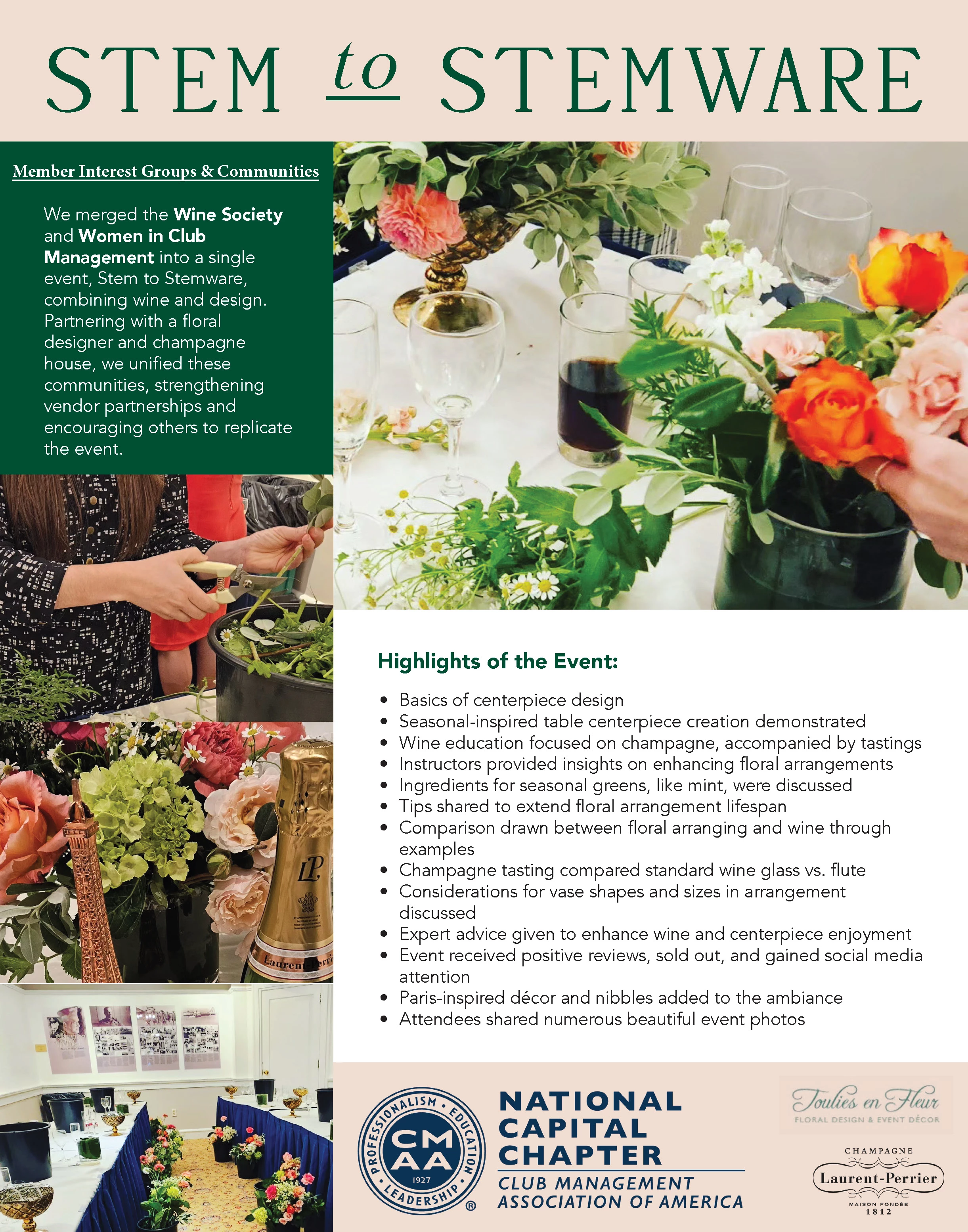 We were inspired and blended 2 interest groups; Wine Society and Women in Club Management to create the Stem to Stemware event. With the idea of marrying wine and design, we partnered with 2 vendors; a floral designer and a champagne house to be featured. We have strengthened both partnerships with these vendors through this opportunity and inspired club managers to bring this event to their own clubs.