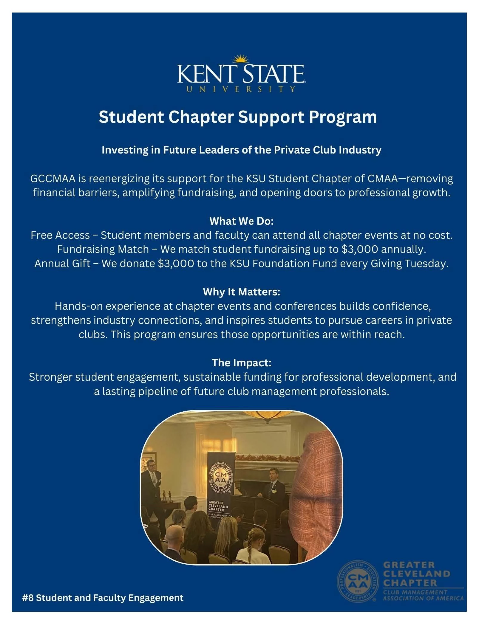 For many years, the Greater Cleveland Chapter CMAA has been proud to support the Kent State University Student Chapter. By expanding its contributions, the Chapter aims to ease financial challenges while giving students valuable opportunities to connect with club leaders and advance their professional development.