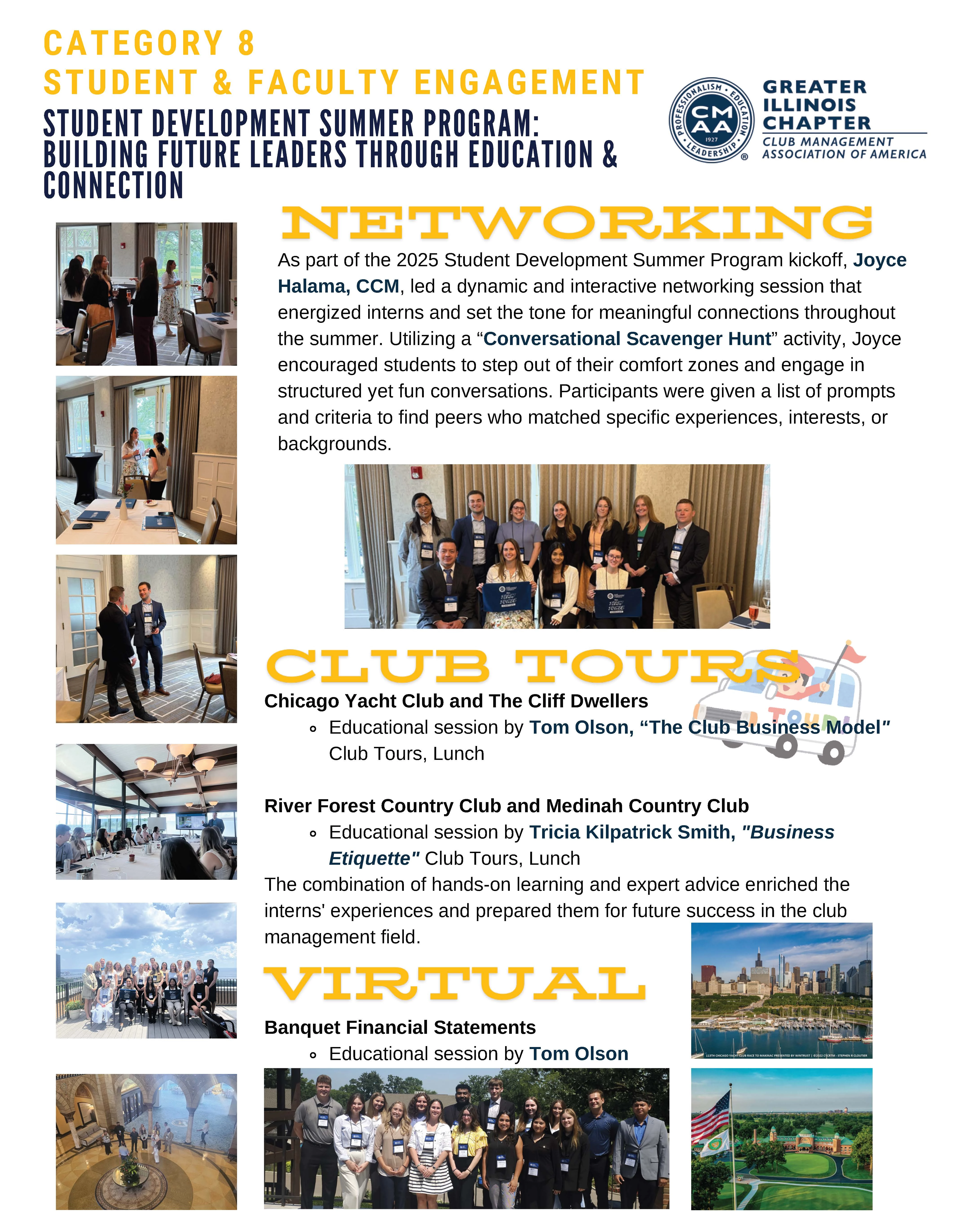 The program kicked off with a vibrant networking session led by Joyce Halama, highlighted by an innovative “Conversational Scavenger Hunt.” This interactive activity encouraged interns to authentically connect by finding peers who matched specific traits, experiences, or interests such as similar professional roles or unique hobbies. The exercise reinforced the use of the F.O.R.M. method (Family, Occupation, Recreation, Motivation), empowering students to practice meaningful and confident conversation skills. Throughout the summer, interns participated in educational sessions, club tours, and valuable mentorship opportunities with industry professionals. Two in-person education days were hosted in partnership with club tours and lunch, featuring Tom Olson of Club Benchmarking, who explored the Club Business Model, and Tricia Kilpatrick Smith, who led an engaging session on Business Etiquette. Additionally, a virtual education session with Tom Olson offered a deep dive into banquet financial statements. The program’s blend of structured learning and purposeful networking provided interns with the confidence and connections needed for future success. Feedback from participants has been overwhelmingly positive, emphasizing the supportive environment, enhanced growth, and the lasting relationships built for their club management careers.