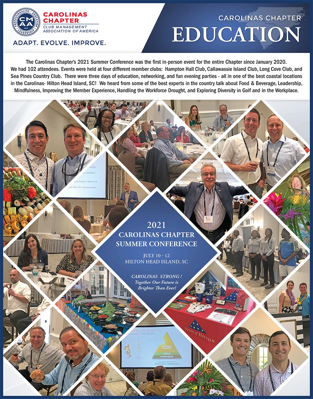 To accomplish this goal, we included events at four different clubs over the Conference's three days so that attendees could enjoy the amenities at as many of our facilities as possible. Additionally, we endeavored to include as many speakers and topics as we could to reinforce the needs of our members post-pandemic, both personally and professionally. We also followed CMAA's new Diversity-Equity-Inclusion initiative by bringing in a keynote speaker on this topic. The attendees responded extremely positively to these offerings and thoroughly enjoyed the opportunities to interact with each other. We always take a survey of attendees after Chapter events, and almost all of the sessions and events of this Conference earned primarily "Excellent" ratings. As always, we based our planning decisions and selections on CMAA's tag line for 2021: Adapt. Evolve. Improve.