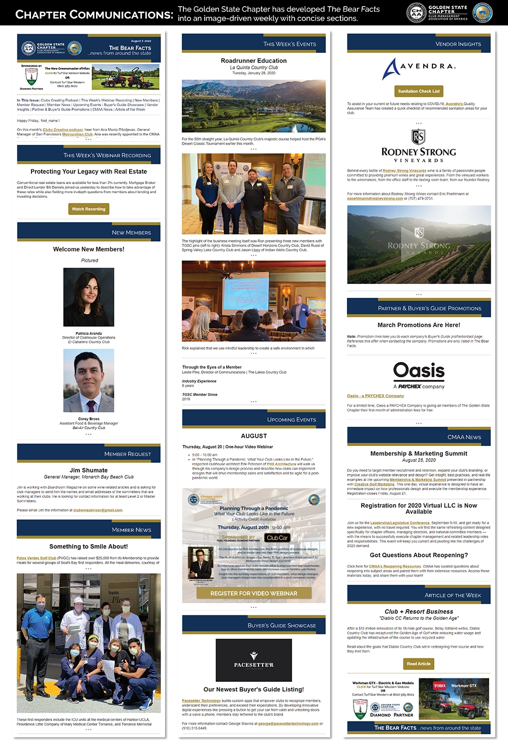 In 2019-2020, The Golden State Chapter’s weekly, The Bear Facts, has been developed into a continuous scroll email that has consistent, concise subsections, each labeled with clear, descriptive headings. The lead content as well as subsections in the current issue are listed at the top of each The Bear Facts. Overall, this has enhanced the chapter by creating ease of use and efficiency for members perusing content and by creating more opportunities to highlight TGSC Partners and Buyer’s Guide Participants, helping them have a stronger ROI on their investment with us.