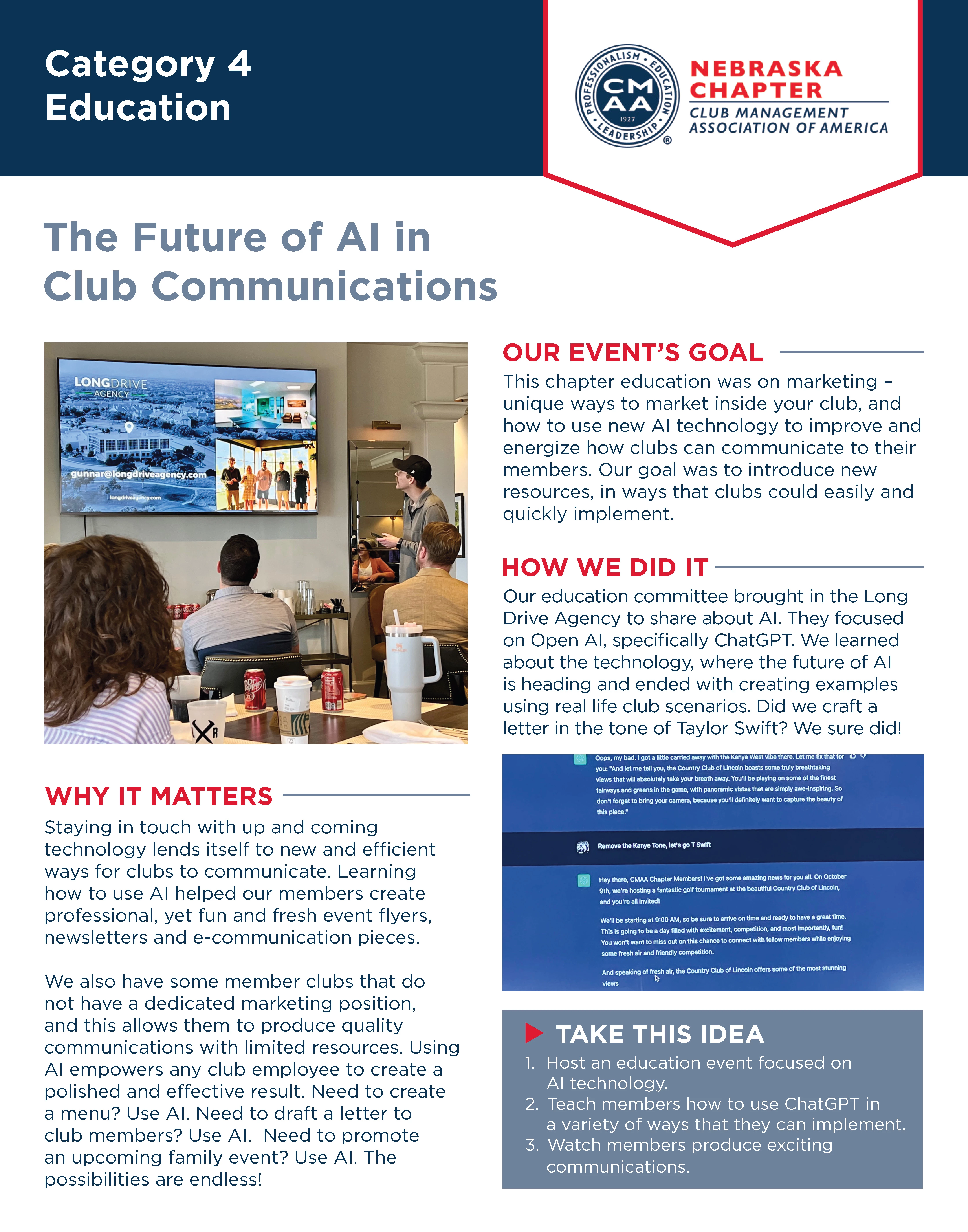 Our chapter enjoys hearing the latest in trends and technology, and this education session touched on both. Not to mention, we had fun using AI using real upcoming club events. We've even used AI to energize some of our chapter publications!