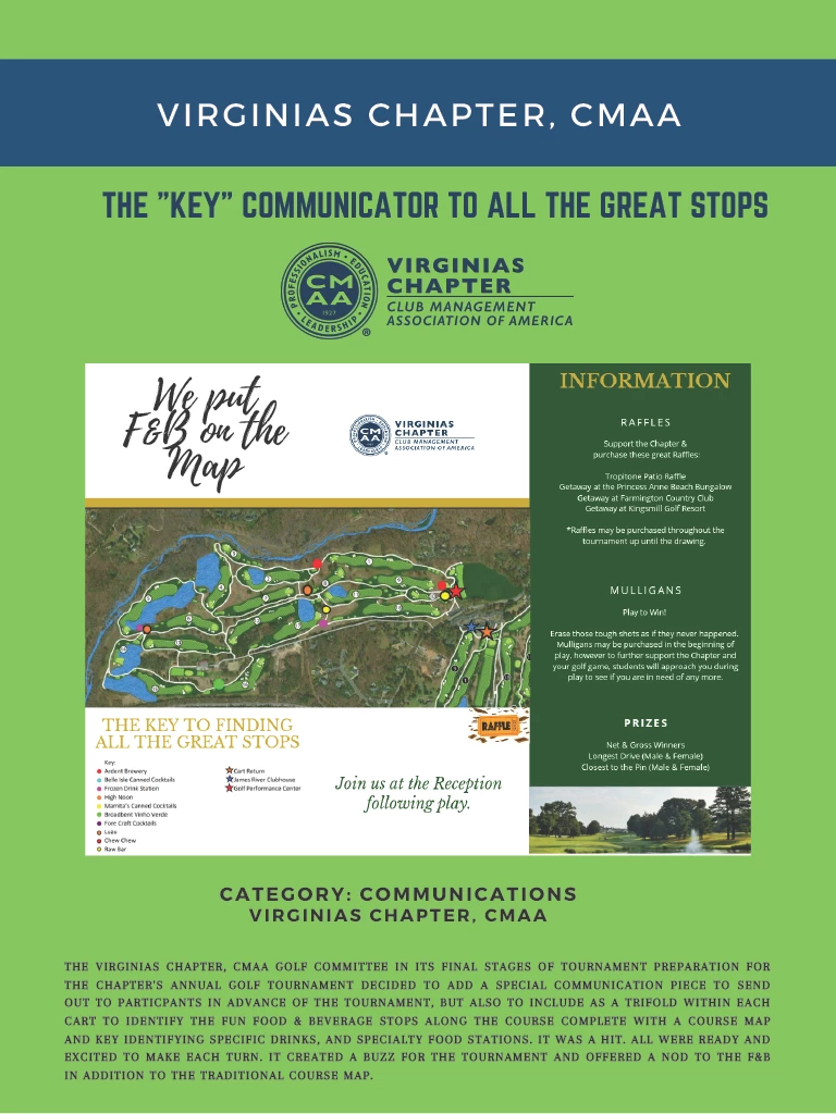 The Virginias Chapter, CMAA Golf Committee in its final stages of Tournament Preparation for the Chapter's Annual Golf Tournament decided to add a special communication piece to send out to participants in advance of the Tournament, but also to include as a trifold within each cart to identify the fun Food & Beverage stops along the course complete with a course map and key identifying specific drinks, and specialty food stations. It was a hit. All were ready and excited to make each turn. It created a buzz for the tournament and offered a nod to the F&B in addition to the traditional course map.