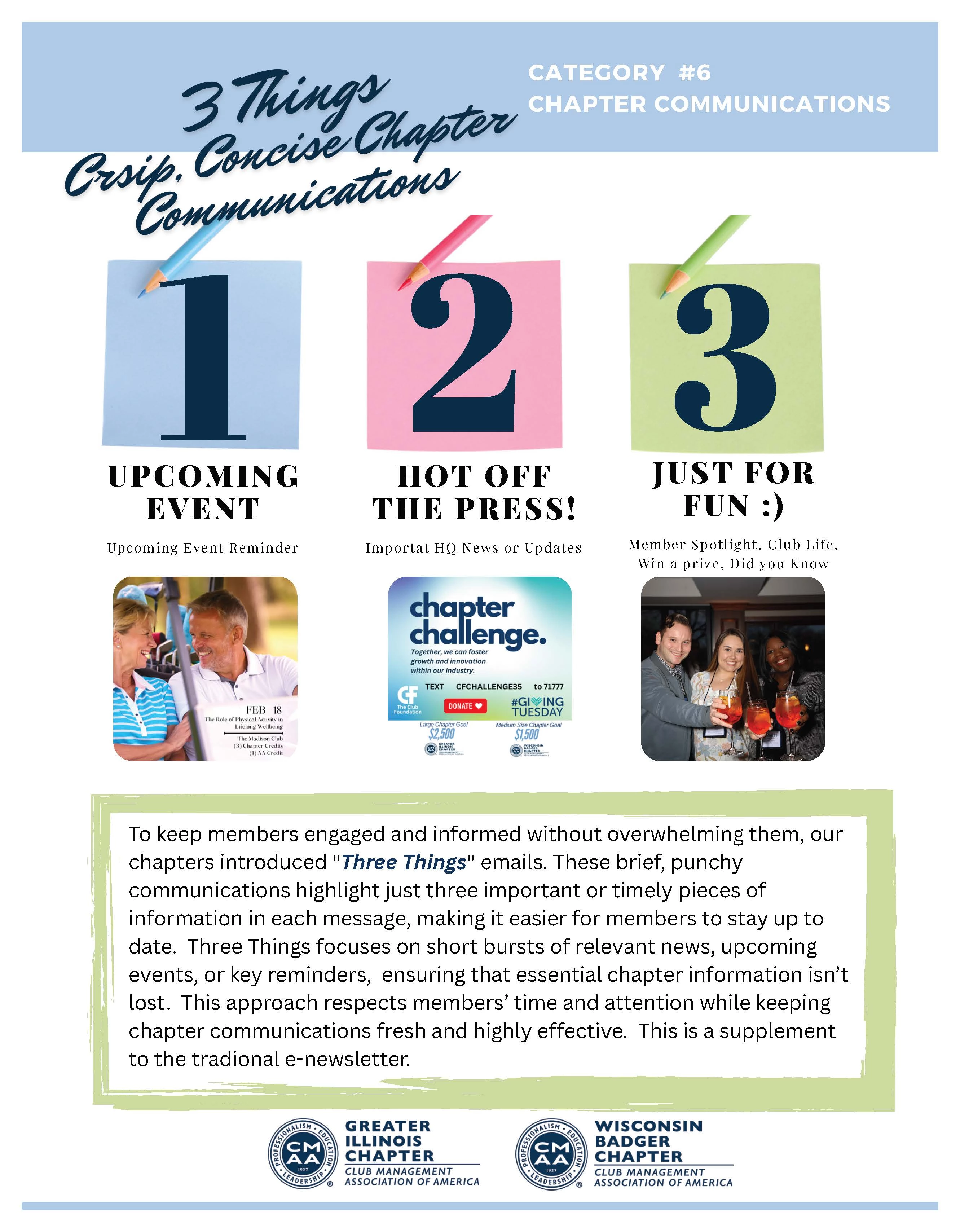 To keep members engaged and informed without overwhelming them, our chapters, Wisconsin and Greater Illinois, introduced "Three Things" emails. These brief, punchy communications highlight just three important or timely pieces of information in each message, making it easier for members to stay up to date. By focusing on short bursts of relevant news, upcoming events, or key reminders, we’ve improved open rates and ensured that essential chapter information isn’t lost. This approach respects members’ time and attention while keeping chapter communications fresh and highly effective.