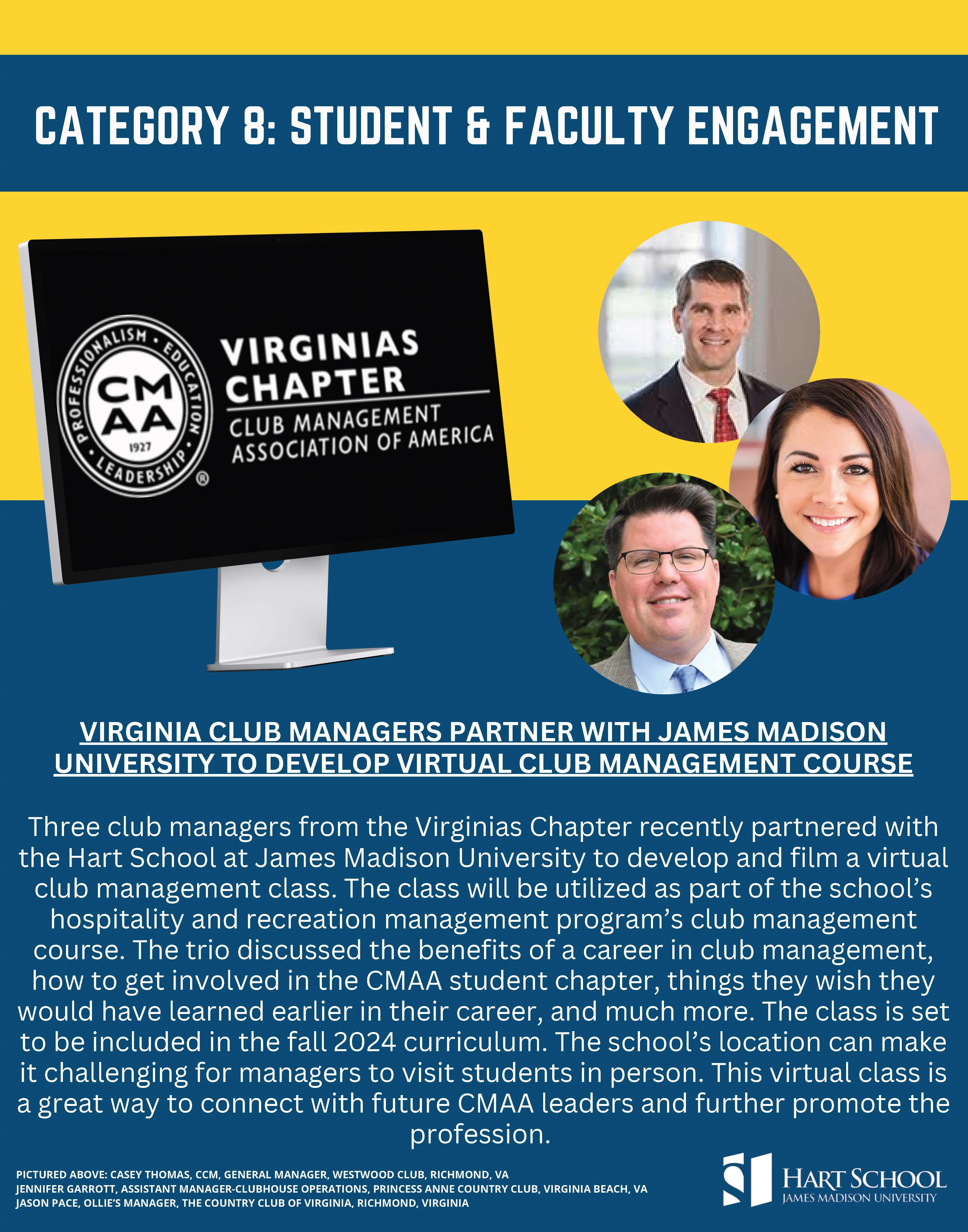 Three club managers from the Virginias Chapter recently partnered with the Hart School at James Madison University to develop and film a virtual club management class. The class will be utilized as part of the school’s hospitality and recreation management program’s club management course. The trio discussed the benefits of a career in club management, how to get involved in the CMAA student chapter, things they wish they would have learned earlier in their career, and much more. The class is set to be included in the fall 2024 curriculum. The school’s location can make it challenging for managers to visit students in person. This virtual class is a great way to connect with future CMAA leaders and further promote the profession.