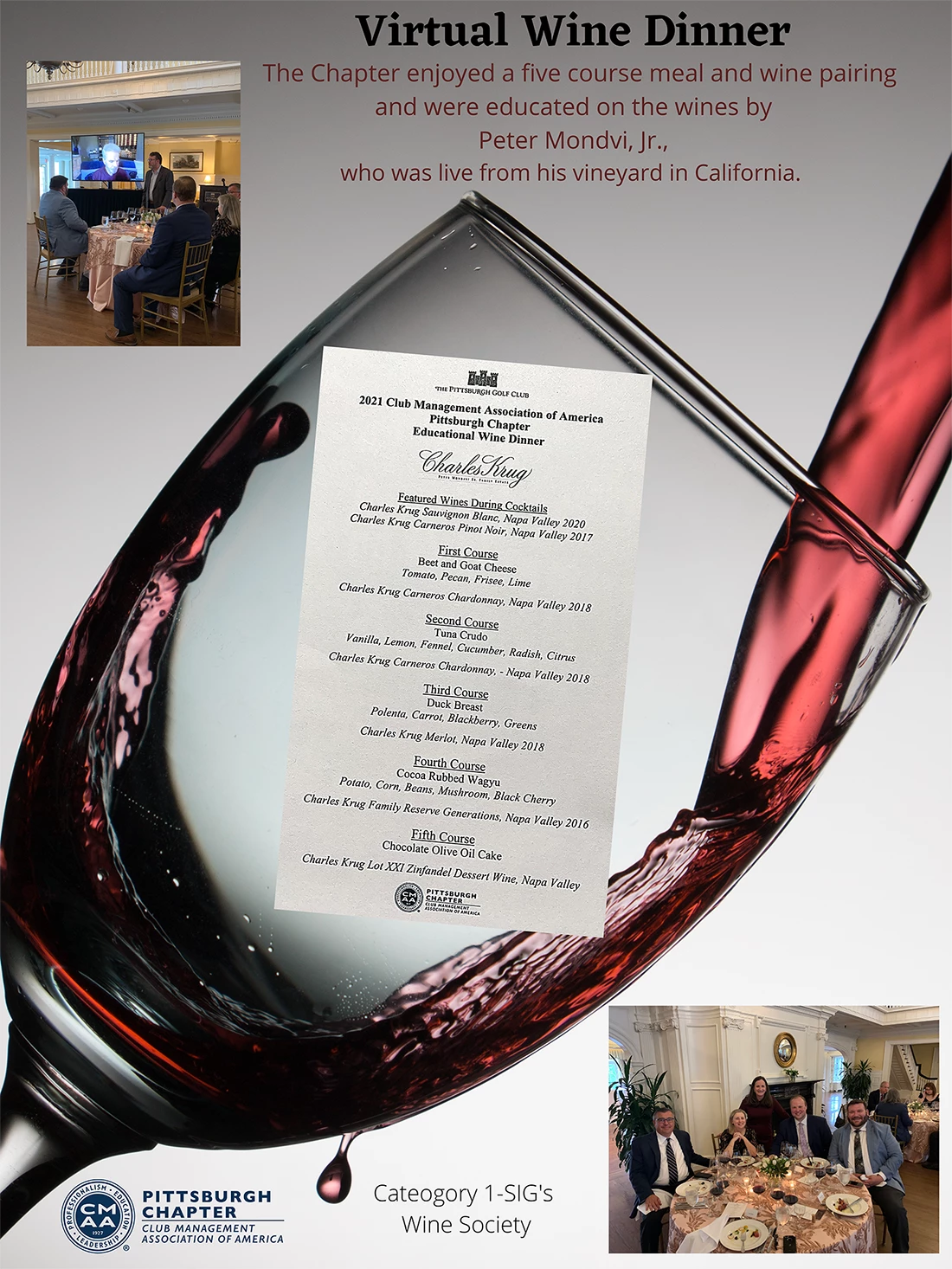 Our event host worked with Charles Krug wines and paired the wines with each course. The members enjoyed the unique educational format with the virtual speaker, who could be seen very well on the big screen. Questions could be asked in real time. Our chapter is going to have a wine dinner in May each year now.