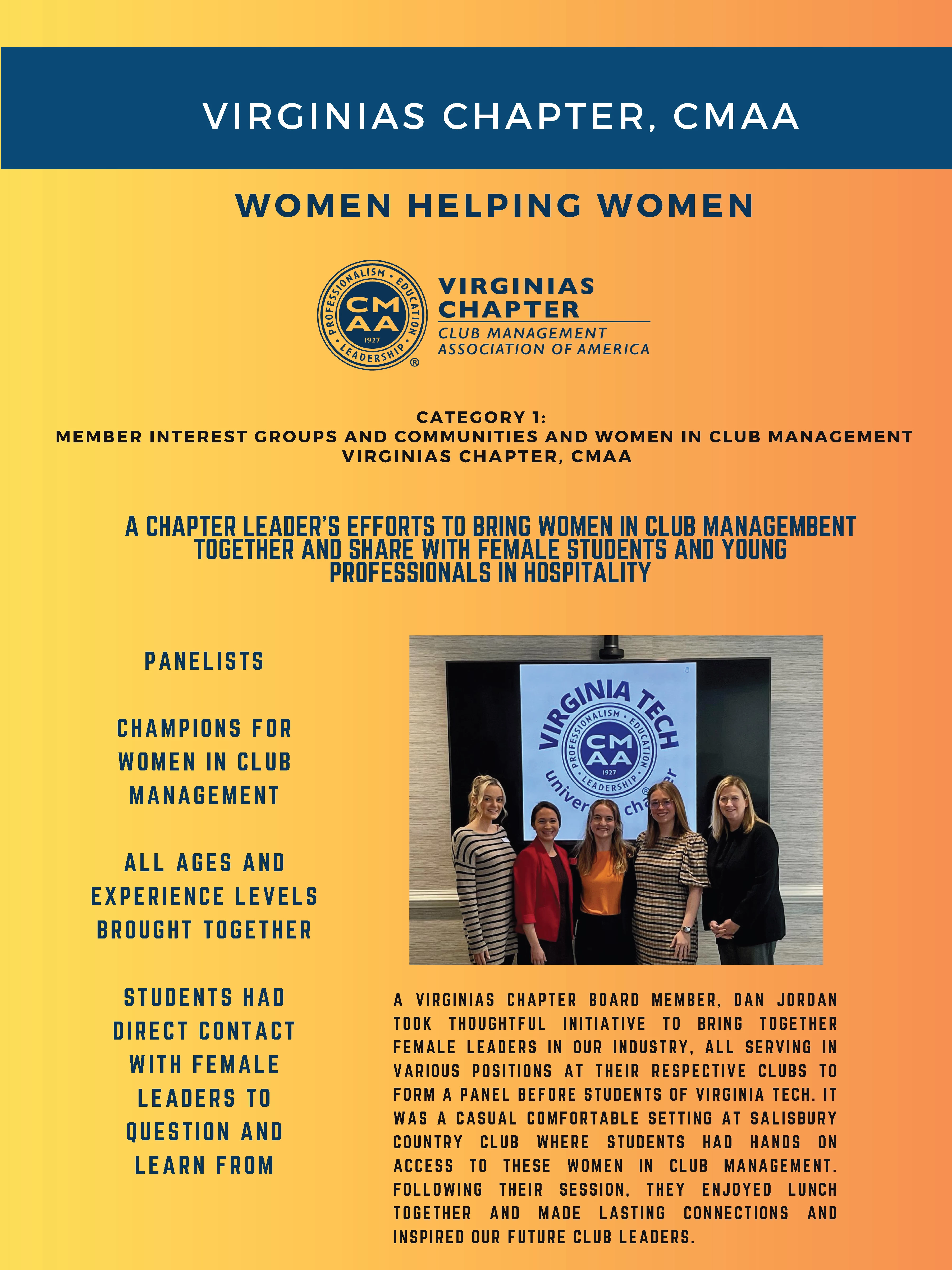 A Virginias Chapter Board Member, and Student Chapter liaison identified female leaders who would be willing to serve on a panel before female students of Virginia Tech. He invited the club management leaders and the students for lunch at his club. It created a comfortable inviting environment for learning and sharing among women in hospitality. It paved the way for additional casual learning opportunities for women in club management.