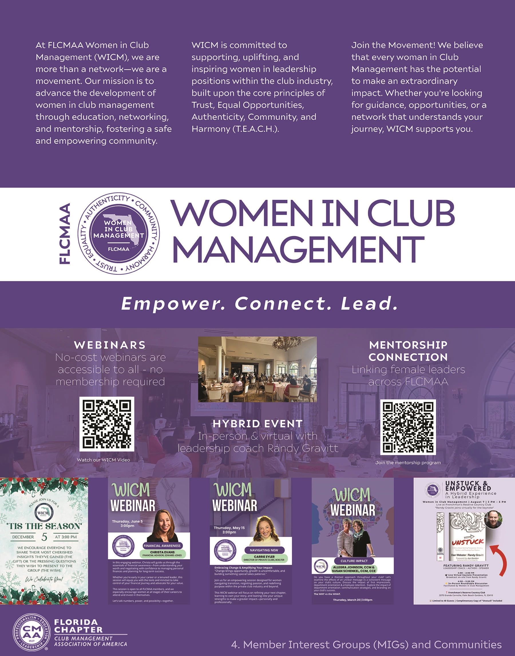 Women in Club Management (WICM) was built to empower, connect, and uplift, but its unique strength comes from being open to all genders and accessible to both members and non-members. By creating an inclusive platform, WICM not only provides women with role models who reflect their journey and future but also invites allies and peers to join in shaping a stronger, more collaborative industry. For the chapter, this has been transformative. It has grown engagement, inspired new voices, and fostered an environment where differences are celebrated as unique contributions to collaboration and team success. WICM has strengthened our leadership pipeline, created broader awareness of the industry, and established a supportive community that reflects the values of empowerment, authenticity, and opportunity for all.