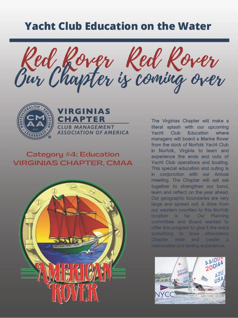 The Virginias Chapter will make a literal splash with our upcoming Yacht Club Education where managers will board a Marine Rover from the dock of Norfolk Yacht Club in Norfolk, Virginia to learn and experience the ends and outs of Yacht Club operations and boating. This special education and outing is in conjunction with our Annual meeting. The Chapter will set sail together to strengthen our bond, learn and reflect on the year ahead. Our geographic boundaries are very large and spread out. A drive from our western counties to this Norfolk location is far. Our Planning committee and Board wanted to offer this program to give it the extra something to draw attendance Chapter wide and create a memorable and lasting experience.
