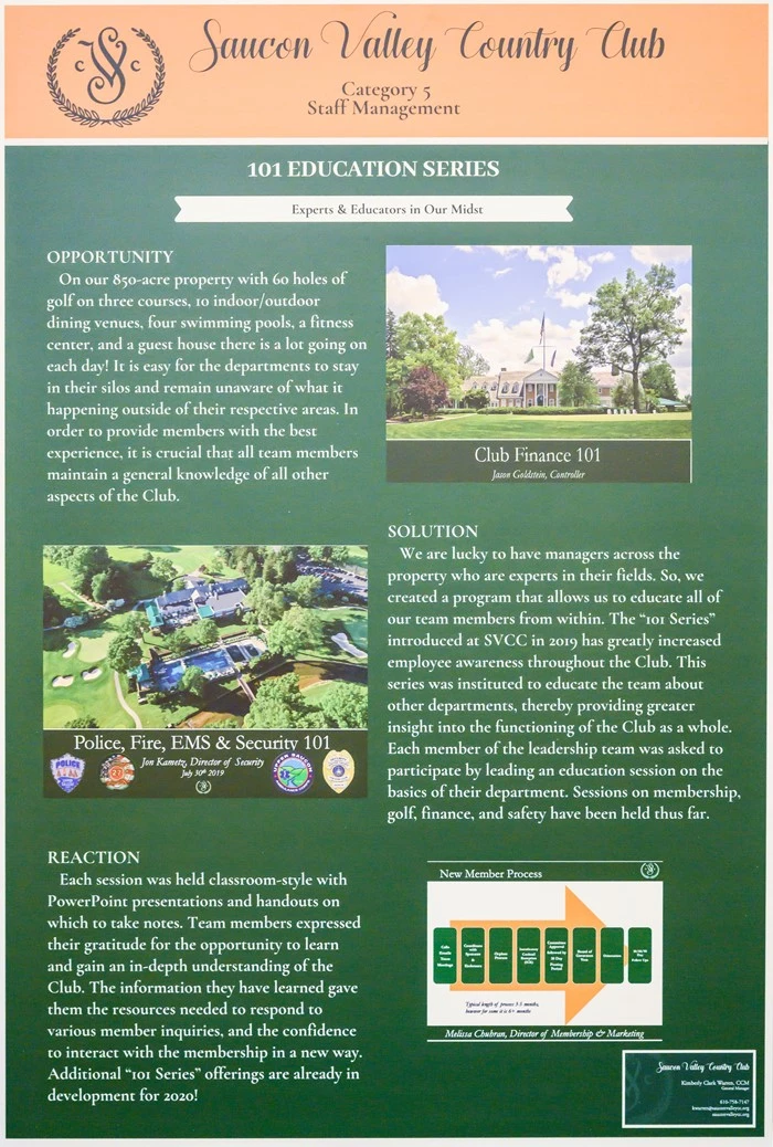 On our 850-acre property with 60 holes of golf on three courses, 10 indoor/outdoor dining venues, four swimming pools, a fitness center, and a guest house there is a lot going on each day! It is easy for the departments to stay in their silos and remain unaware of what it happening outside of their respective areas. In order to provide members with the best experience, it is crucial that all team members maintain a general knowledge of all other aspects of the Club. We are lucky to have managers across the property who are experts in their fields. So, we created a program that allows us to educate all of our team members from within. The “101 Series” introduced at SVCC in 2019 has greatly increased employee awareness throughout the Club. This series was instituted to educate the team about other departments, thereby providing greater insight into the functioning of the Club as a whole. Each member of the leadership team was asked to participate by leading an education session on the basics of their department. Sessions on membership, golf, finance, and safety have been held thus far.