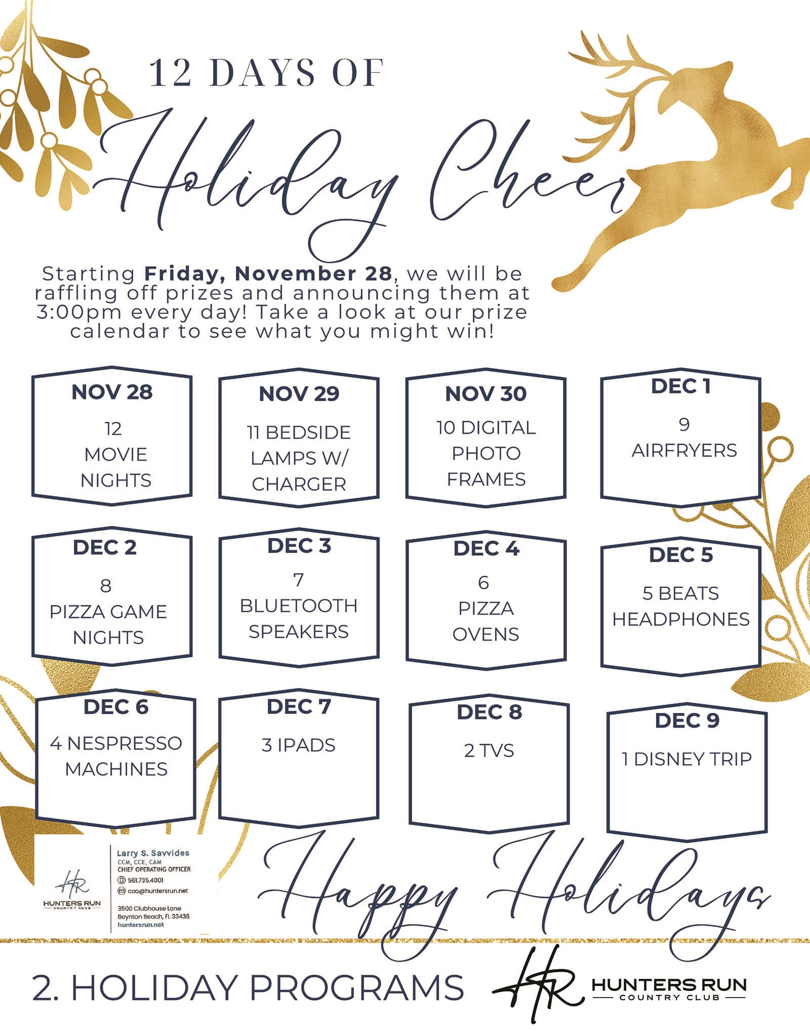 The "12 Days of Holiday Cheer" program has significantly enhanced our club's operations by fostering a festive atmosphere and encouraging member and employee engagement during the holiday season. By offering exciting daily prizes and creating anticipation with a well-structured prize calendar, the initiative has boosted morale, participation, and overall holiday spirit among participants.