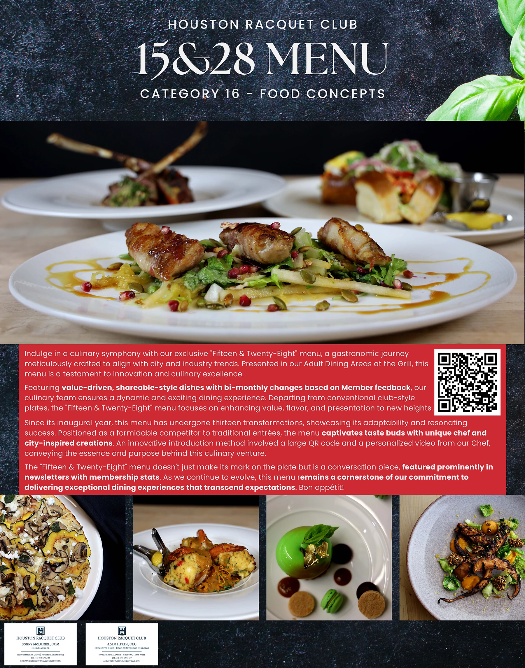 Since its inaugural year, this menu has undergone thirteen transformations, showcasing its adaptability and resonating success. Positioned as a formidable competitor to traditional entrées, the menu captivates taste buds with unique chef and city-inspired creations. An innovative introduction method involved a large QR code and a personalized video from our Chef, conveying the essence and purpose behind this culinary venture. Members love the variety this menu brings to the Club and always look forward to the new 15&28 offerings.