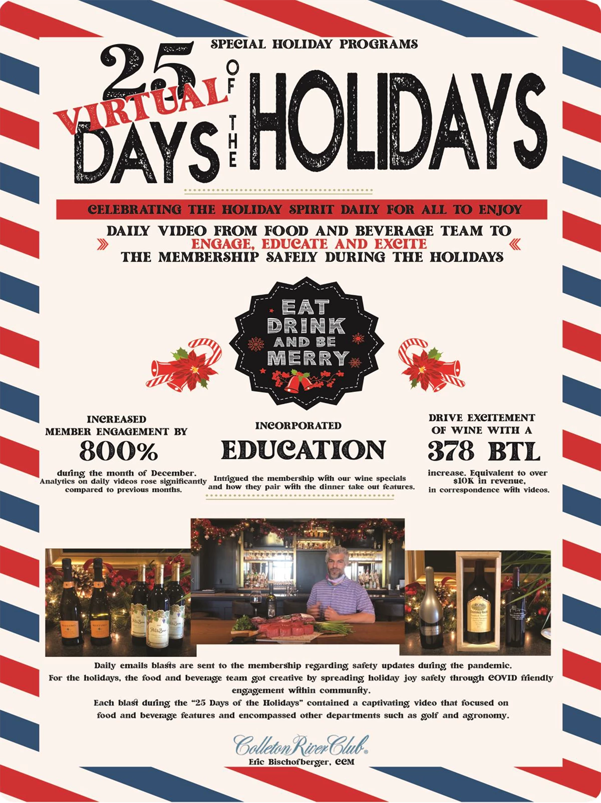 The 25 Days of the Holidays was sparked when we recognized two major areas working for the club during this different time. The two areas that we combined were technology and bulk wine sales. Each day of December leading to Christmas we advertised a different F&B special that could be ordered by calling front desk and safely picked up with our contactless pick-up program. Several days we incorporated other departments such as Golf Shop which led to educational opportunities during the videos too! The extraordinary success of this program was shown through member engagement and increase of package revenue.