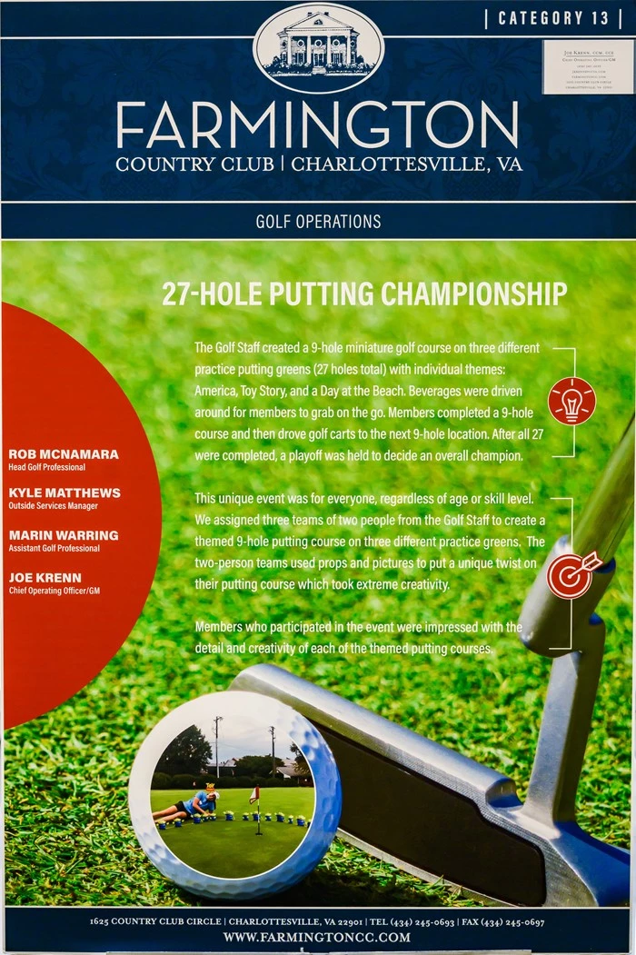 The Golf Staff created a 9-hole miniature golf course on three different practice putting greens (27 holes total) with individual themes: America, Toy Story, and a Day at the Beach. Beverages were driven around for members to grab on the go. Members completed a 9-hole course and then drove golf carts to the next 9-hole location. After all 27 were completed, a playoff was held to decide an overall champion.