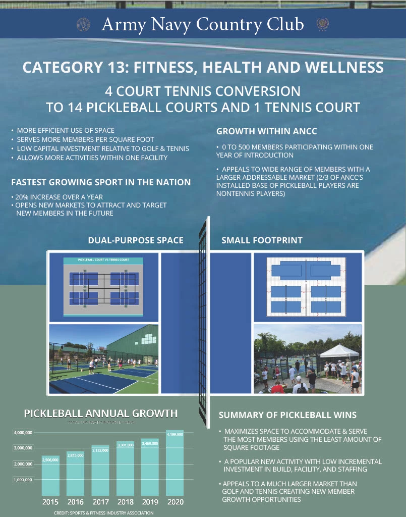 We converted four of our tennis courts into fourteen pickleball courts and one tennis court. This sport appeals to a much larger market than golf and tennis, creating new member growth opportunities. In just one year we've gone from zero to 500 members participating, two-thirds of which are non-tennis players.