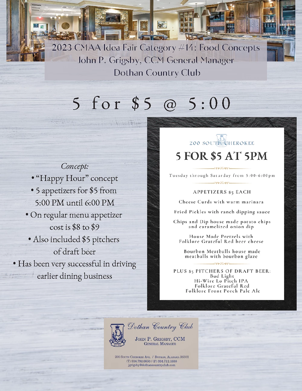 5 for $5 @ 5:00. Happy Hour appetizer specials. Has driven earlier business in the dining room.