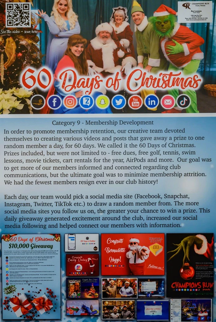 In order to promote membership retention, our creative team devoted themselves to creating various videos and posts that gave away a prize to one random member a day for 60 days. We called it the 60 days of Christmas. Prizes included, but were not limited to - free dues, free golf, tennis, swim lessons, movie tickets, cart rentals for the year, AirPods and more. Our goal was to get our members more informed and connected, especially in our colder months when the pool is not open. The ultimate goal was to minimize attrition. We had the fewest members resign ever in our club history!