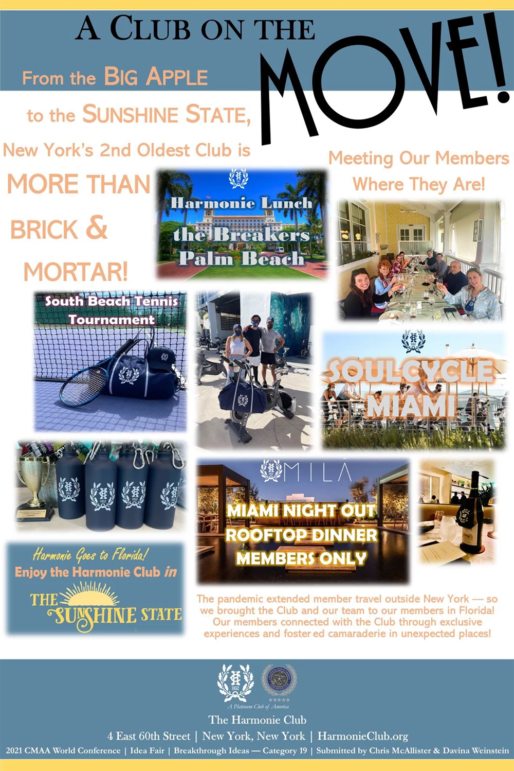 The pandemic hit New York City hard - especially the hospitality industry. During these unprecedented times, the Harmonie Club had to reimagine what a club can be through virtual programs that promote camaraderie and fellowship and by keeping our club relevant to our members - wherever they are. Taking our club on the move and bringing activities and programs from NYC to our members in Florida enhanced our operation by keeping members involved while also staying safe with outdoor activities. We have a large demographic of snowbirds who did not return to NYC because of the pandemic. Keeping them all connected with the Club heightened the idea that our club is more than brick & mortar and our members can share a special community anywhere they are.