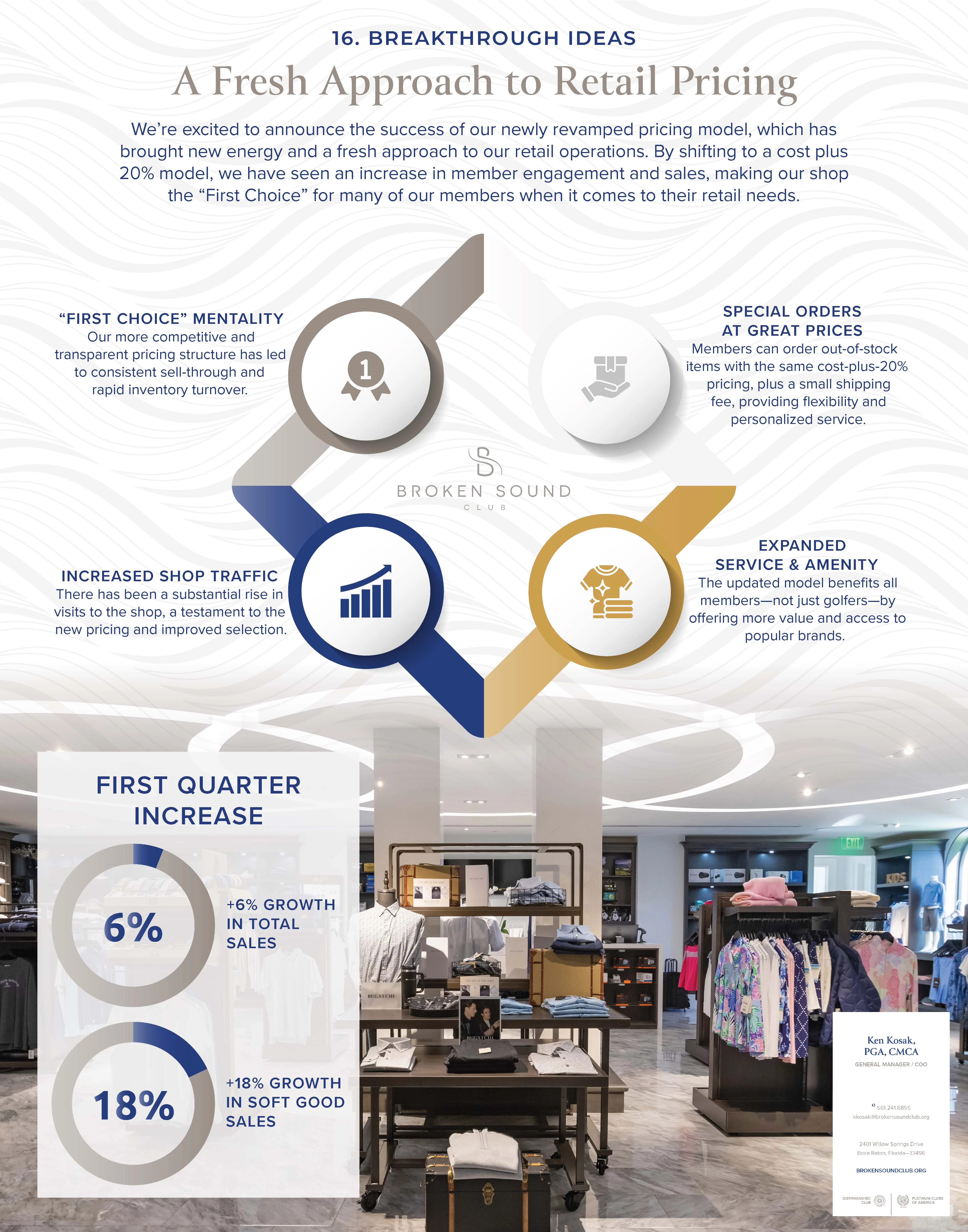 The goal of the new pricing model was to make our pro shops the “First Choice” for members' personal shopping, holiday gifts, and special occasions. The new pricing model has brought new energy and a fresh approach to our retail operations. By shifting to a cost-plus-20% structure, we’ve seen an increase in member engagement and sales, positioning our shop as the go-to place for retail needs. The member response has been overwhelmingly positive.