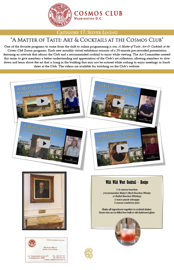 One of the favorite programs to come from the shift to online programming is our "A Matter of Taste: Art & Cocktails at the Cosmos Club" zoom programs. Each new monthly virtual exhibition consists of a 20-minute pre-recorded presentation featuring an artwork that adorns the Club and a recommended cocktail to enjoy while viewing. The Art Committee created this series to give members a better understanding and appreciation of the Club’s art collection, allowing members to slow down and learn about the art that is hung in the building that may not be noticed while rushing to enjoy meetings or lunch dates at the Club.