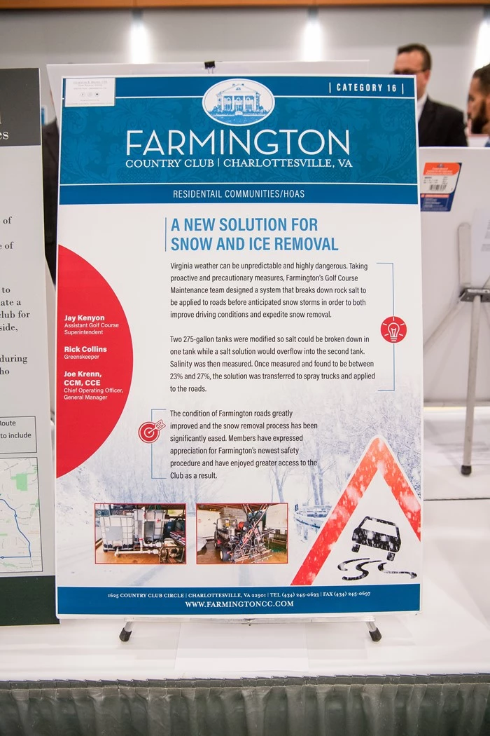 Virginia weather can be unpredictable and highly dangerous. Taking proactive and precautionary measures, Farmington’s Golf Course Maintenance team designed a system that breaks down rock salt to be applied to roads before anticipated snow storms in order to both improve driving conditions and expedite snow removal. Two 275-gallon tanks were modified so salt could be broken down in one tank while a salt solution would overflow into the second tank. Salinity was then measured. Once measured and found to be between 23% and 27%, the solution was transferred to spray trucks and applied to the roads.