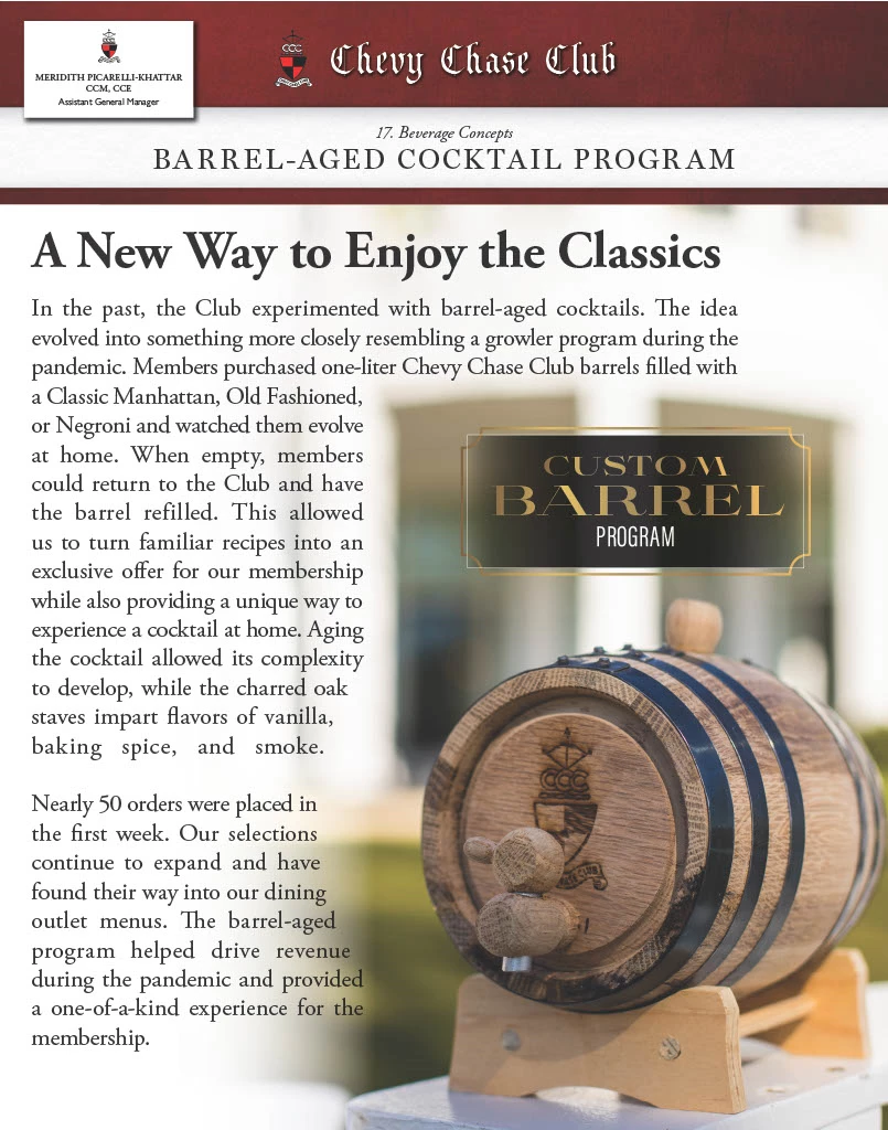 In order to gain traction for the program, we included registration information in our weekly bulletin. We were unsure if there would be any interest whatsoever, but the response was overwhelming. Nearly 50 orders were placed in the first week, and it only progressed from there. Our barrel-aged cocktail list continues to expand and has made its way onto the cocktail menus of our dining outlets. The Barrel-Aged program not only helped drive revenue during the pandemic and provide a one-of-a-kind experience for the membership, but it helped our in-house barrel-aged cocktail program to take off. Barrels are returned frequently to be refilled, and we often see members in the dining room selling barrels to their friends or wanting to try the next aged cocktail on deck.