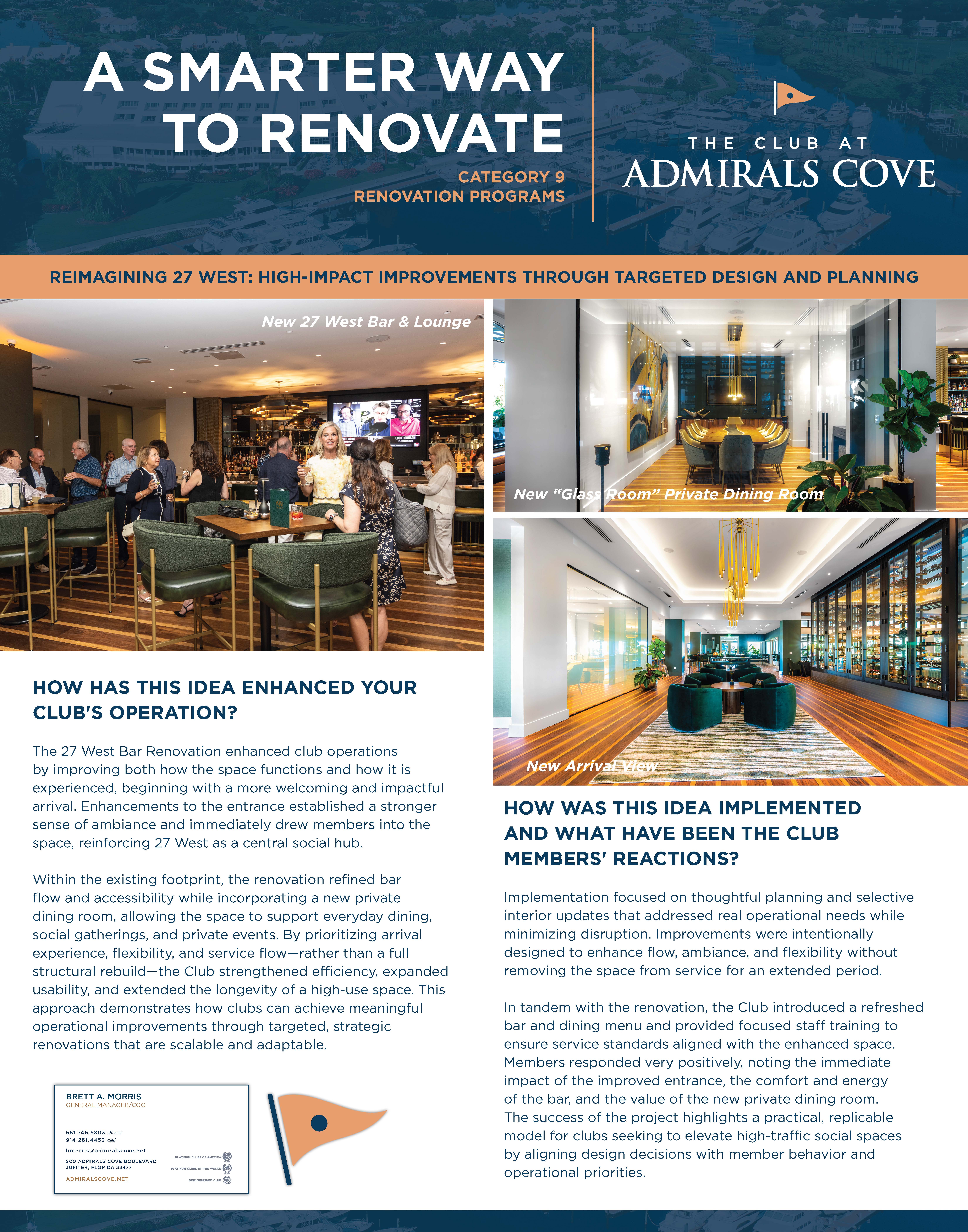 In tandem with the renovation, the Club introduced a refreshed bar and dining menu and provided focused staff training to ensure service standards aligned with the enhanced space. Members responded very positively, noting the immediate impact of the improved entrance, the comfort and energy of the bar, and the value of the new private dining room. The success of the project highlights a practical, replicable model for clubs seeking to elevate high-traffic social spaces by aligning design decisions with member behavior and operational priorities.