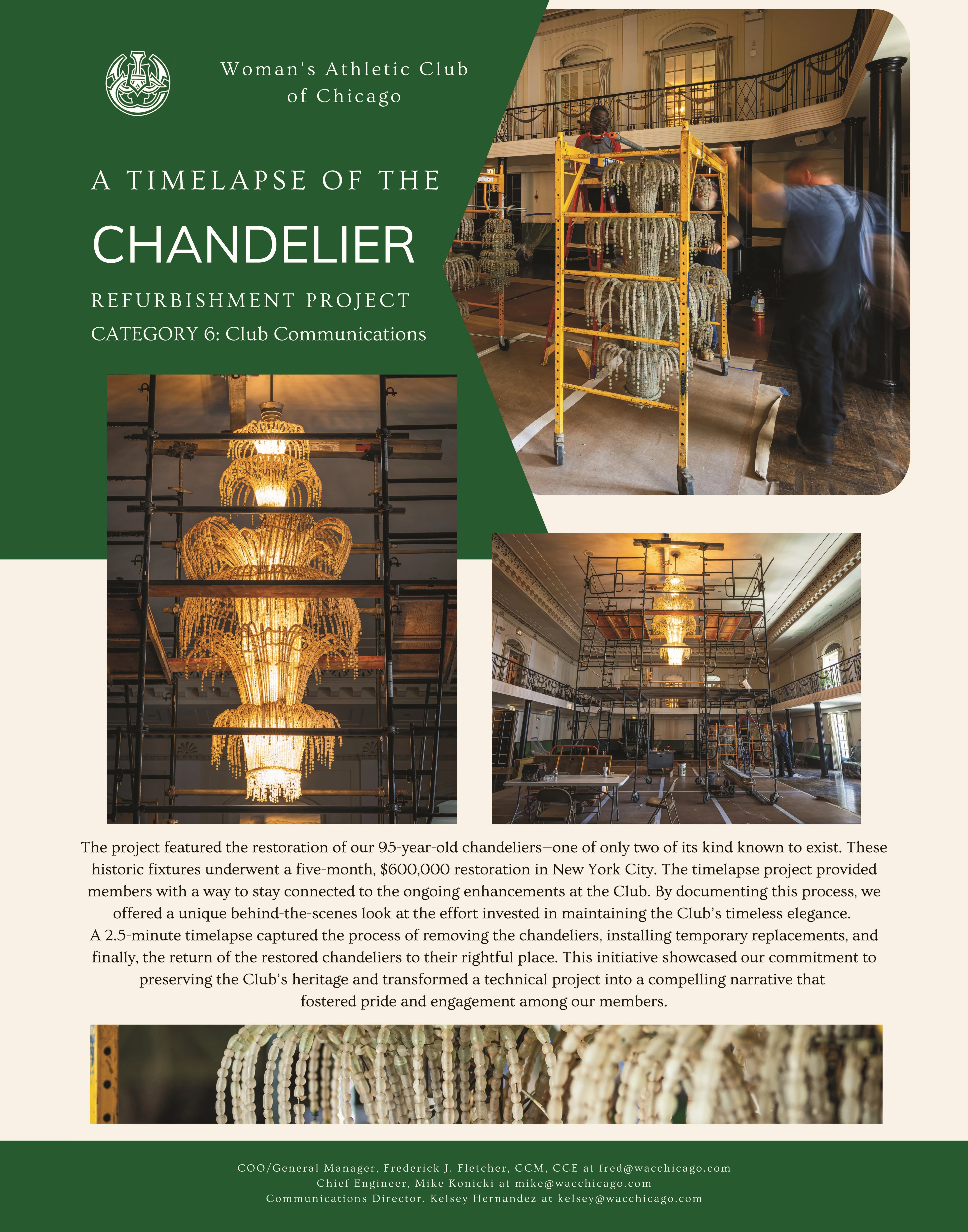 The project featured the restoration of our 95-year-old chandeliers—one of only two of its kind known to exist. These historic fixtures underwent a five-month, $600,000 restoration in New York City to ensure they shine brilliantly for the next 95 years. The chandelier refurbishment timelapse project provided members with a way to stay connected to the ongoing enhancements at the Club. By documenting this process, we offered a unique behind-the-scenes look at the effort invested in maintaining the Club’s timeless elegance. A 2.5-minute timelapse captured the process of removing the chandeliers, installing temporary replacements, and finally, the return of the restored chandeliers to their rightful place. This initiative showcased our commitment to preserving the Club’s heritage and transformed a technical project into a compelling narrative that fostered pride and engagement among our members.