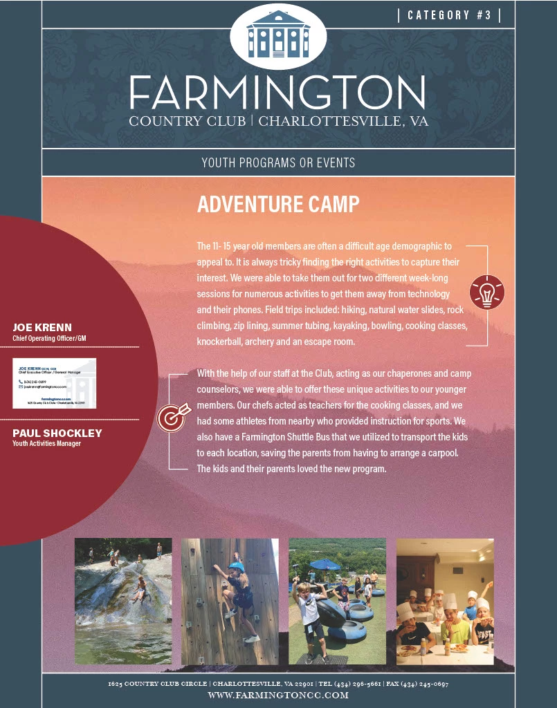 With the help of our staff at the Club, acting as our chaperones and camp counselors, we were able to offer these unique activities to our younger members. Our chefs acted as teachers for the cooking classes, and we had some athletes from nearby who provided instruction for sports. We also have a Farmington Shuttle Bus that we utilized to transport the kids to each location, saving the parents from having to arrange a carpool. The kids and their parents loved the new program.