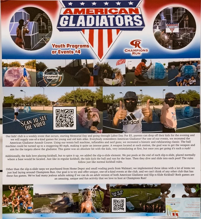 Other than the slip-n-slide tarps we purchased from Home Depot and small wading pools from Walmart; we implemented these ideas with a lot of items we just had laying around Champions Run. Our goal is to try and offer unique, one-of-a-kind events at the club, and we can’t think of any other club that has these fun games. We’ve had many jealous adults asking if we can do an adult version of both American Gladiator and Slip-n-Slide Kickball! Both games are an amazing, unique and fun activity that we love to host at Champions Run!