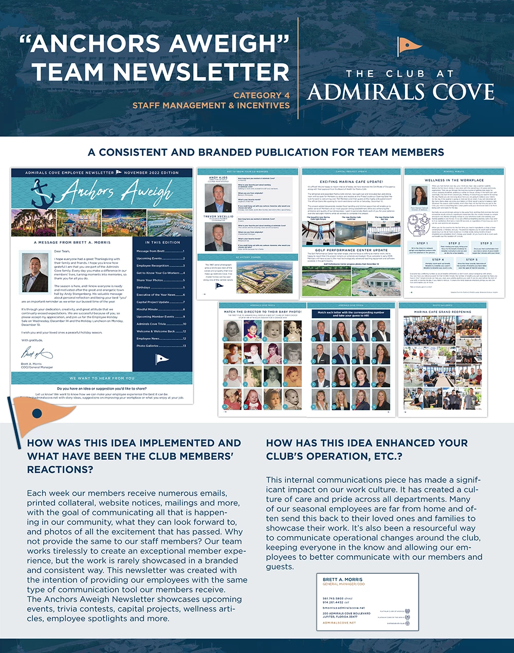 Each week our members receive numerous emails, printed collateral, website notices, mailings and more, with the goal of communicating all that is happening in our community, what they can look forward to, and photos of all the excitement that has passed. Why not provide the same to our staff members? Our team works tirelessly to create an exceptional member experience, but the work is rarely showcased in a branded and consistent way. This newsletter was created with the intention of providing our employees with the same type of communication tool our members receive. The Anchors Aweigh Newsletter showcases upcoming events, trivia contests, capital projects, wellness articles, employee spotlights and more.