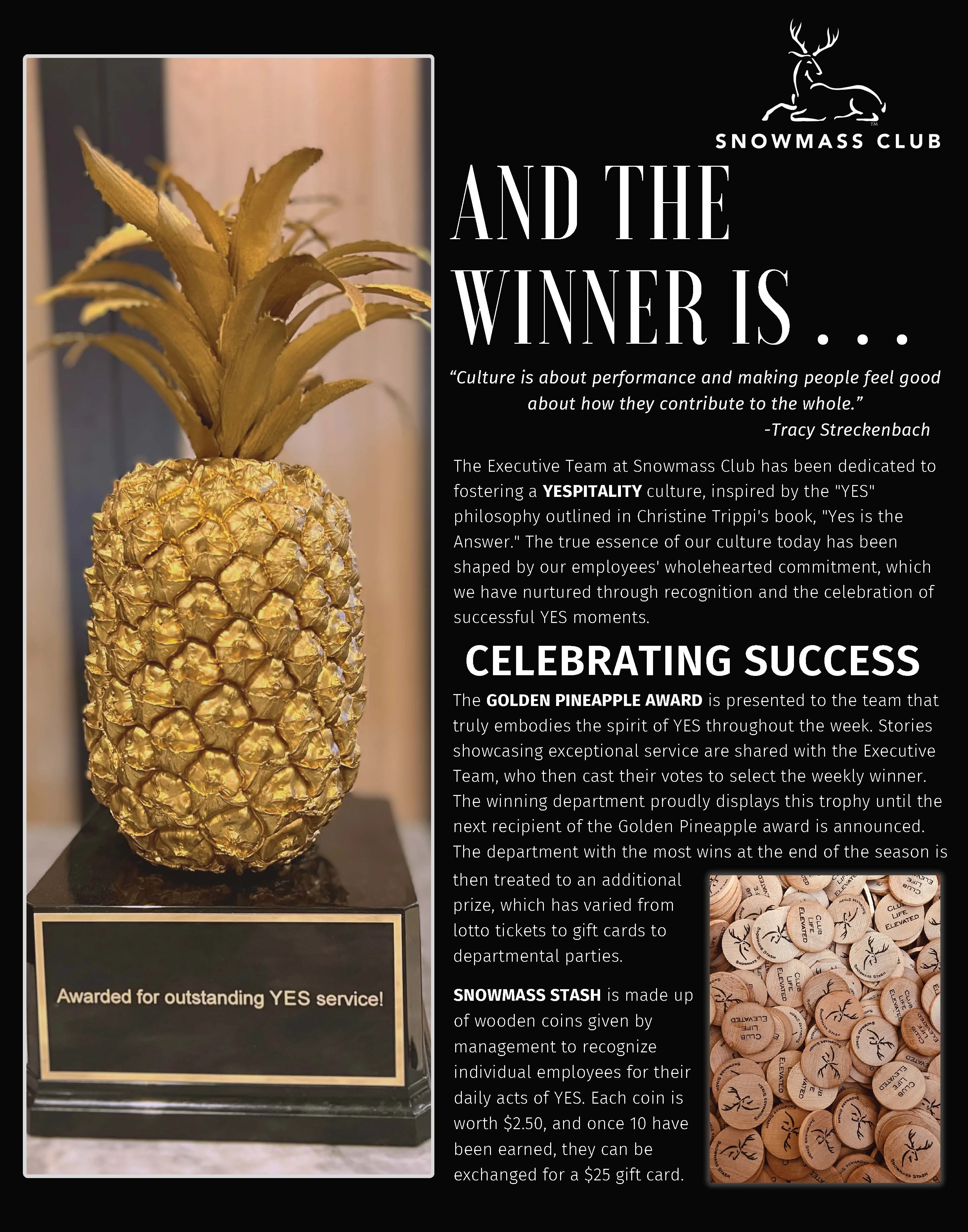 These two simple tools were created to encourage our team to embrace the principles of yespitality (our cultural focus). The friendly competition surrounding the Golden Pineapple and the daily recognition provided by Snowmass Stash not only help us keep our mission, vision, values, and service standards at the forefront of our minds but also contribute to fostering a work environment that celebrates success and attracts individuals who want to be part of our team.