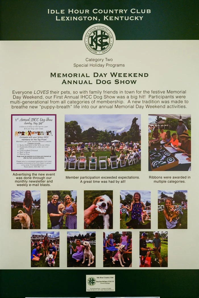 Everyone LOVES their pets, so with family friends in town for the festive Memorial Day Weekend, our 1st annual IHCC Dog Show was a big hit! Custom made ribbons were awarded in multiple categories to include Mutts, Purebreds, Best Dressed/Costumed, Best of Show & Favorite Rescue Dog. Gourmet Dog Cookies were given to all, "Watering holes" were available for both two legged and four legged attendees. A nominal entry fee of $15 covered costs.