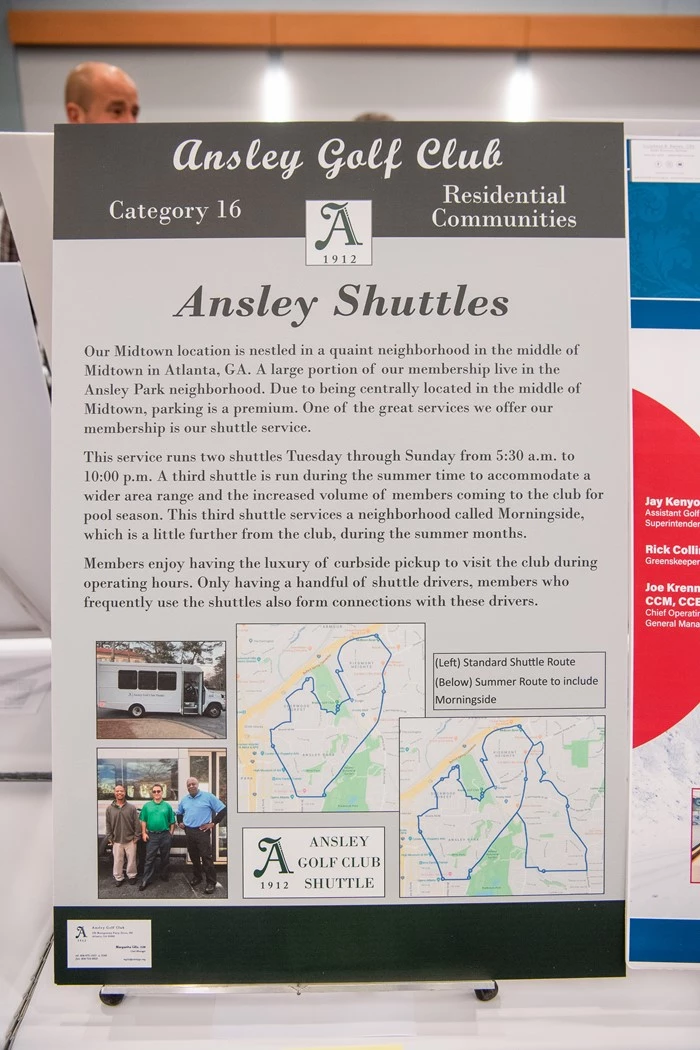 The Ansley shuttle service is comprised of a fleet of vehicles to provide alternative transportation to our employees and members. Ansley Golf Club, located in Midtown Atlanta, is landlocked with no opportunity to expand the club’s footprint. The shuttle service allows for employees to park off property, creating additional parking for members and guests on site. 40% of Ansley’s membership also live within a mile of the clubhouse and with expansion of the fleet, we have been able to shuttle members to and from the club during operating hours.
