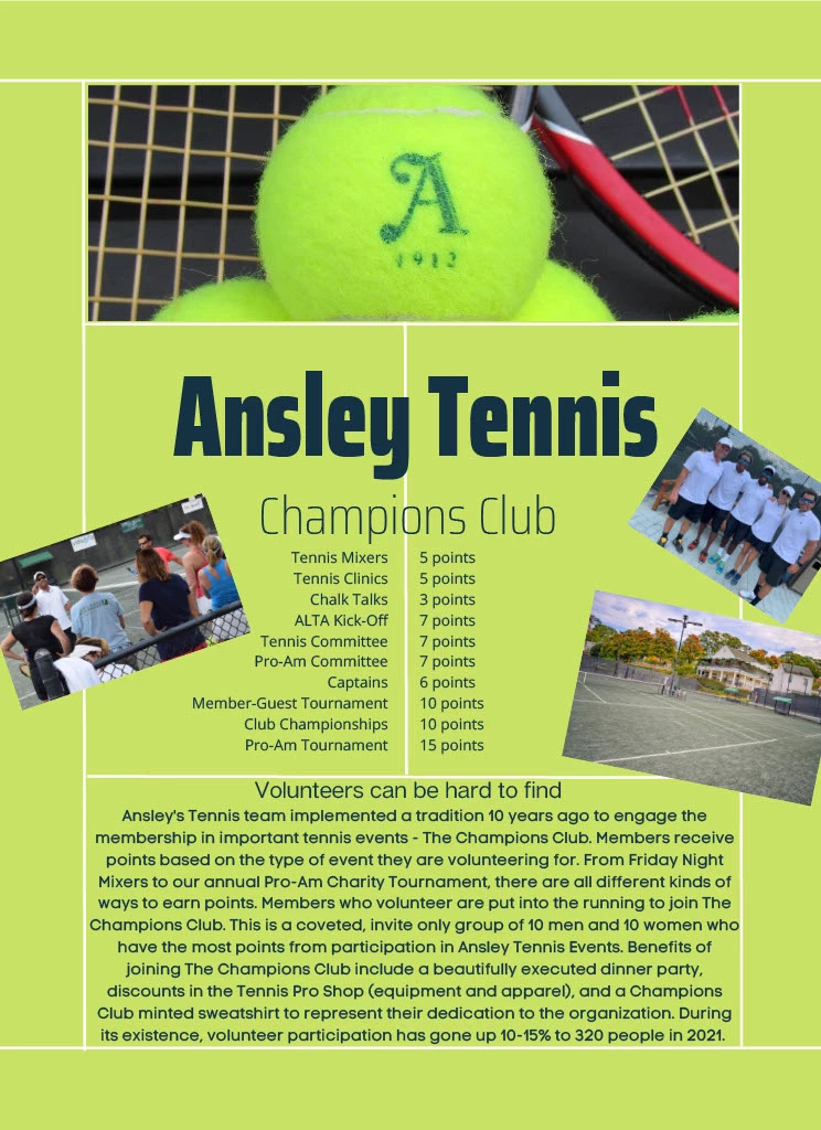 Ansley's Tennis team implemented a tradition 10 years ago to engage the membership in important tennis events - The Champions Club. Members receive points based on the type of event they are volunteering for. From Friday Night Mixers to our annual Pro-Am Charity Tournament, there are all different kinds of ways to earn points. Members who volunteer are put into the running to join The Champions Club. This is a coveted, invite only group of 10 men and 10 women who have the most points from participation in Ansley Tennis Events.