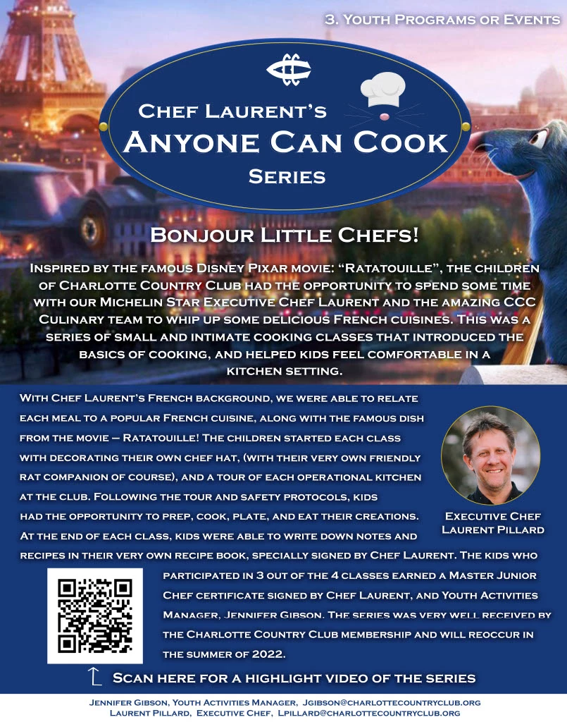 Chef Laurent's "Anyone Can Cook" Series is a small and intimate series of cooking classes for the children members of Charlotte Country Club. The relation to a favorite Disney Pixar movie catches the eye of younger members and gives a sense of comfort to an activity that is new and also intimidating to most young children. This series has enhanced our club operation numerous ways. It has been a great program to help introduce our new Executive Chef to our younger members, and gives both the kids and staff a chance to connect on a closer level. Having children around our staff who do not get as much member interaction as others, helps boost morale and sparks inspiration for more fun and exciting ideas to present to the membership. Offering this program benefits the club by bringing in revenue and attracts the several new families that have been joining our club.